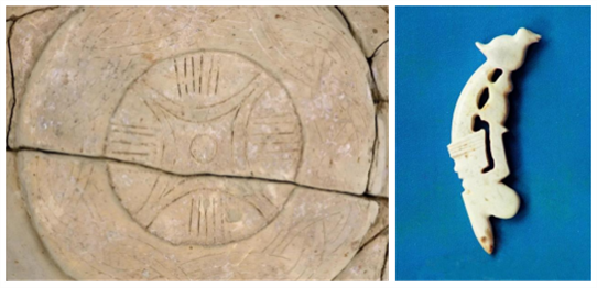 赵陵山遗址出土的“源极图”陶盘、透雕人鸟兽玉饰件