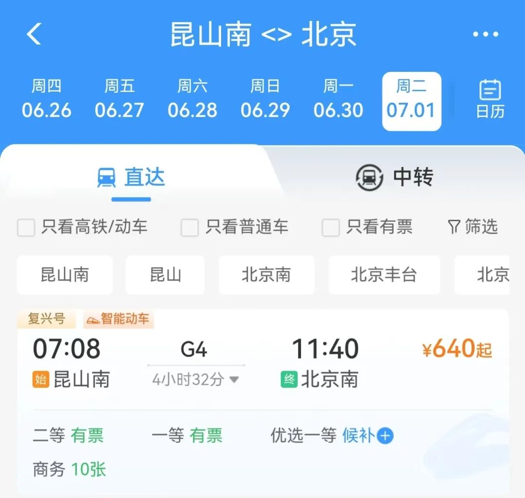在市委市政府的支持推动下,昆山交通会同昆山南站与上级交通部门及铁路部门积极申请沟通,2025年铁路第三季度运行图调整后,自7月1日起,G4次列车将从昆山南站始发,停靠苏州北、无锡东、南京南、济南西等主要站点,全程运行时间约4.5小时,较其他车次单程节省约70分钟。