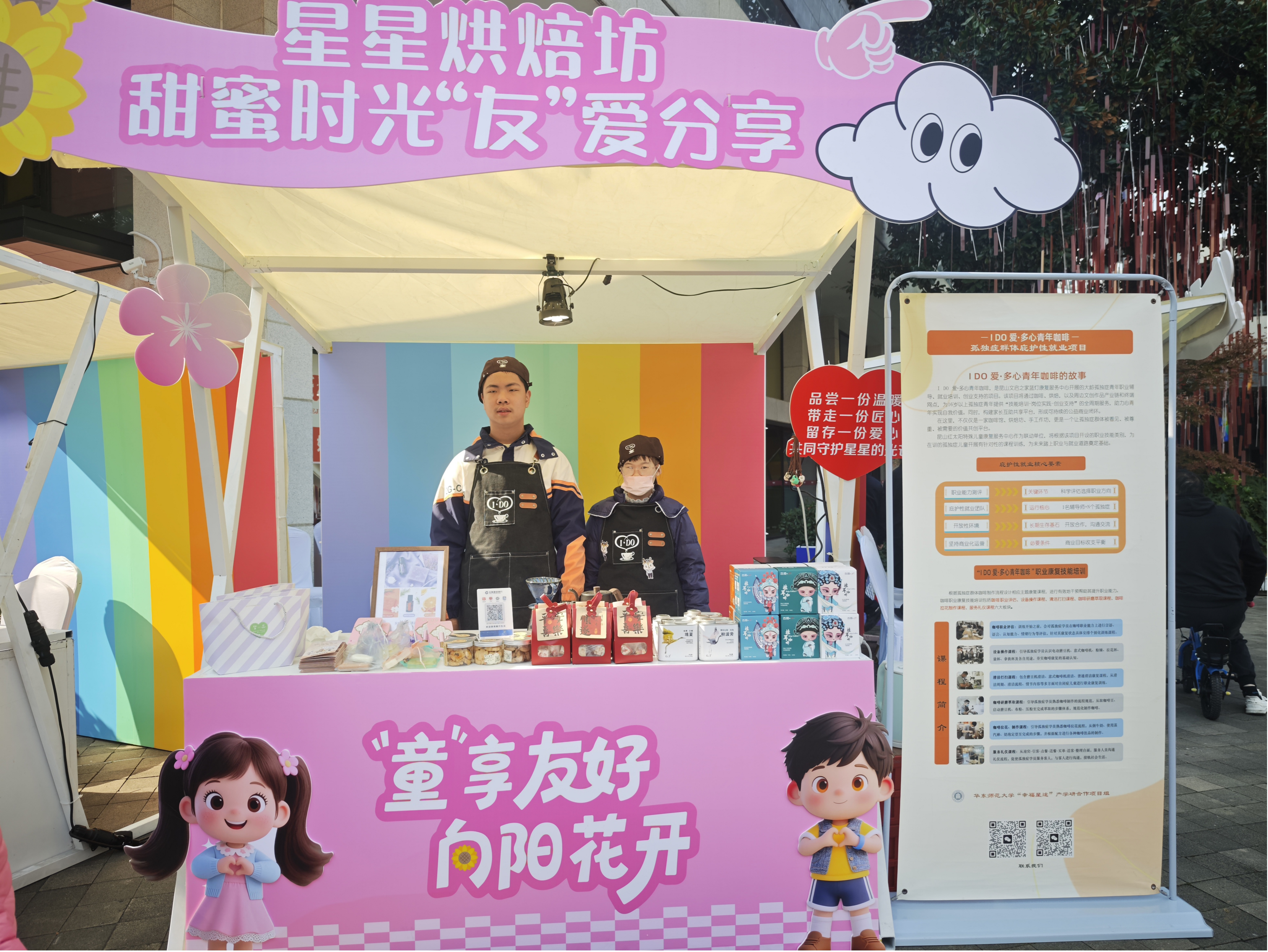 义卖摊位前人流络绎不绝,展台上陈列的每一件物品——手冲咖啡、挂耳咖啡、手工精油皂、手工蛋卷等都凝聚了“心青年”们的专注与用心。三位“心青年”身着统一工作服,勇敢走向人群,主动与宾客交流。他们用略显生涩却真诚的语言,介绍手冲咖啡的风味、讲解手工皂的成分,并向游人发放宣传册,耐心介绍中心的使命与服务。他们的努力与热情,成为活动现场一道动人的风景。
