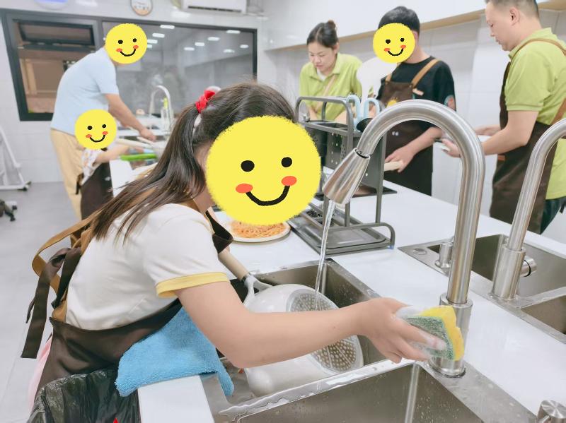 本节课程由昆山心青年就业辅导中心提供场地支持。孩子们自主完成配菜、煮面、煎牛排等步骤,并学习清洗厨具。学员小奕起初害怕热水,在奶奶与老师的多次鼓励下,最终勇敢地将面条下锅,成功完成任务。