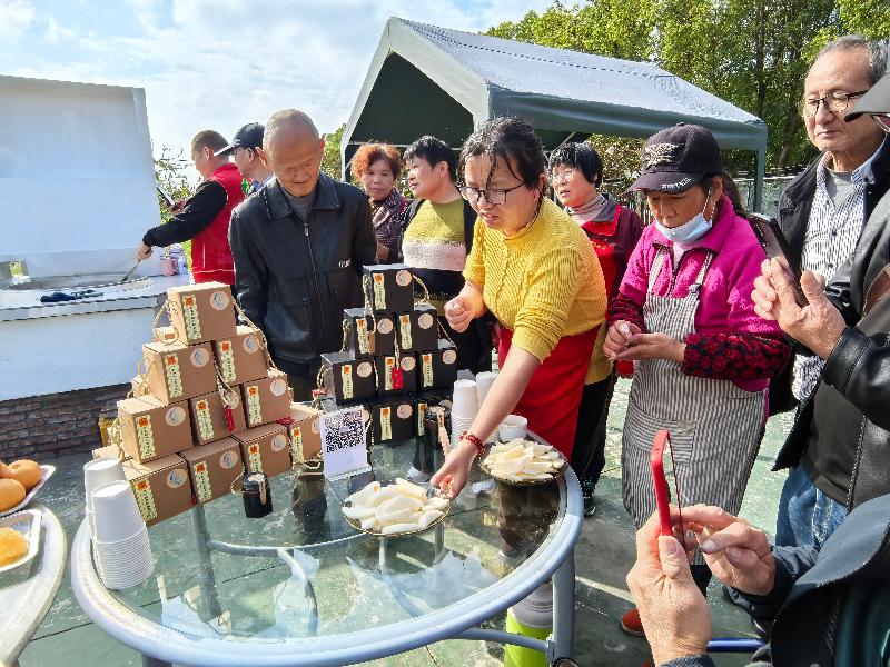 运动会后,众人共同体验张浦传统“古法梨膏”的制作过程。为保障梨膏地道的风味,果园师傅于凌晨五点便开始准备,将新鲜秋梨去皮去核、榨取梨汁,随后将梨汁与红枣、川贝、冰糖等八种天然食材一同倒入大铁锅,以柴火慢熬。志愿者胥先生在现场向大家详细介绍熬制梨膏的原料与工艺。参与者品尝后,纷纷表示梨膏醇香甘甜,暖意融融。