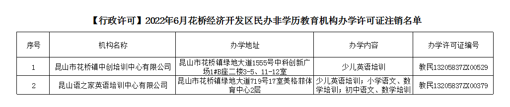 【行政许可】2022年6月花桥经济开发区民办非学历教育机构办学许可证注销名单