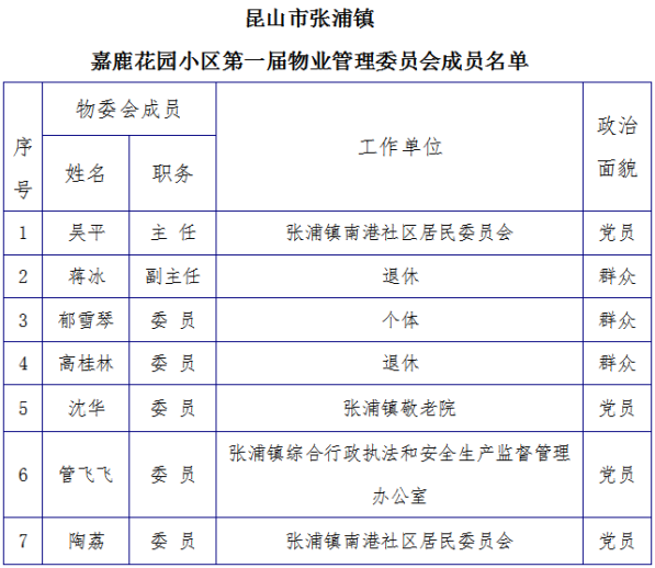 根据《苏州市住宅区物业管理条例》等有关规定,现将张浦镇嘉鹿花园小区第一届物业管理委员会成员名单予以公示。