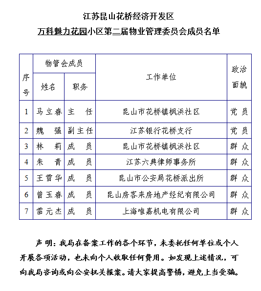 根据《江苏省物业管理条例》《苏州市住宅区物业管理条例》等有关规定,现将花桥经济开发区万科魅力花园小区第二届物业管理委员会名单予以公示。