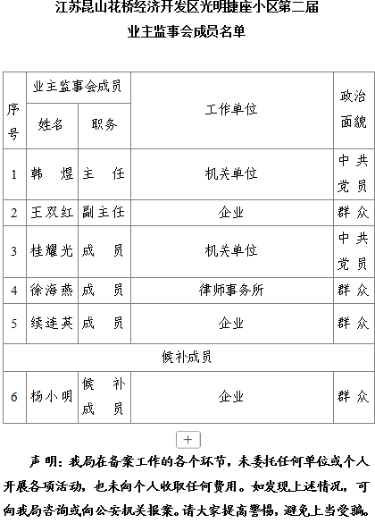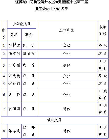 根据《江苏省物业管理条例》《苏州市住宅区物业管理条例》等有关规定,现将花桥经济开发区光明捷座小区第二届业主委员会成员名单予以公示。