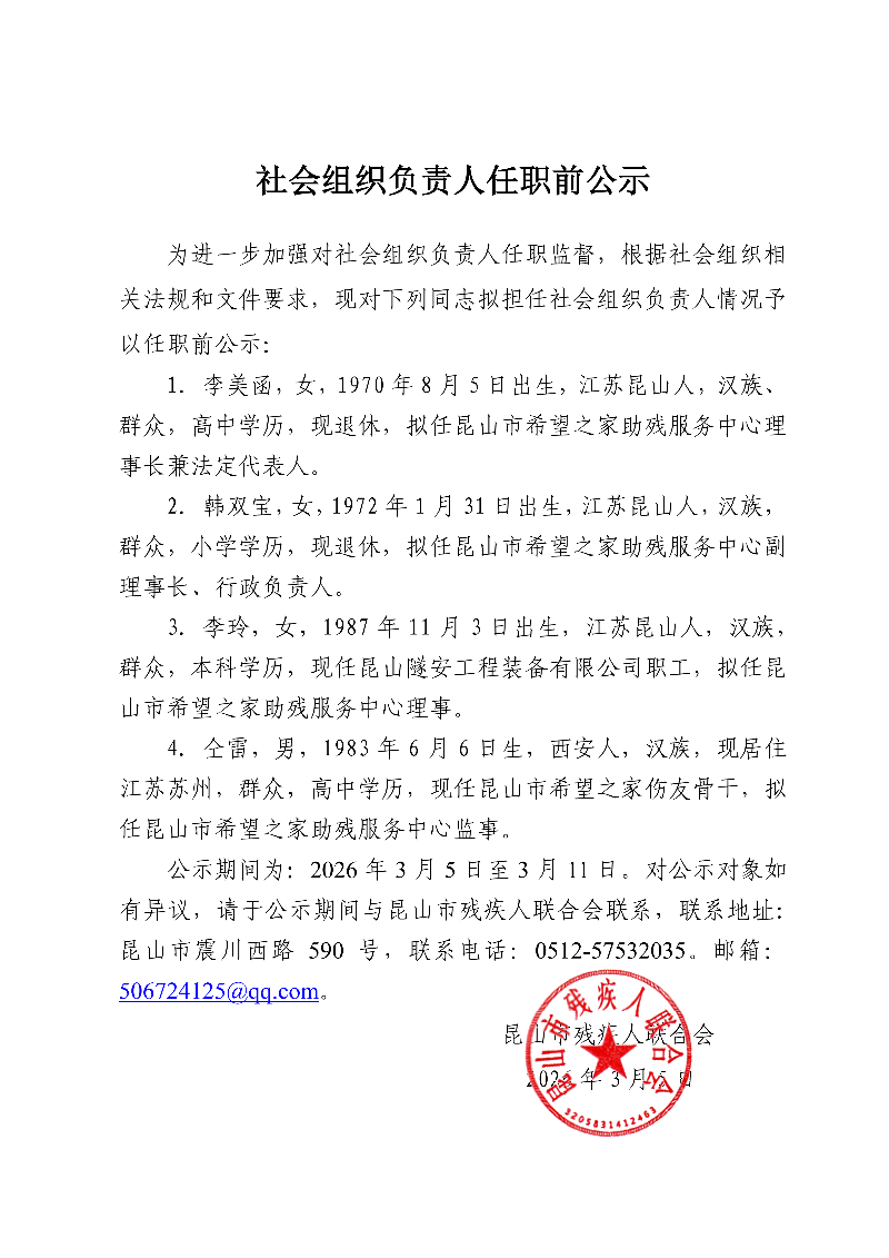 昆山市希望之家助残服务中心负责人任职前公示