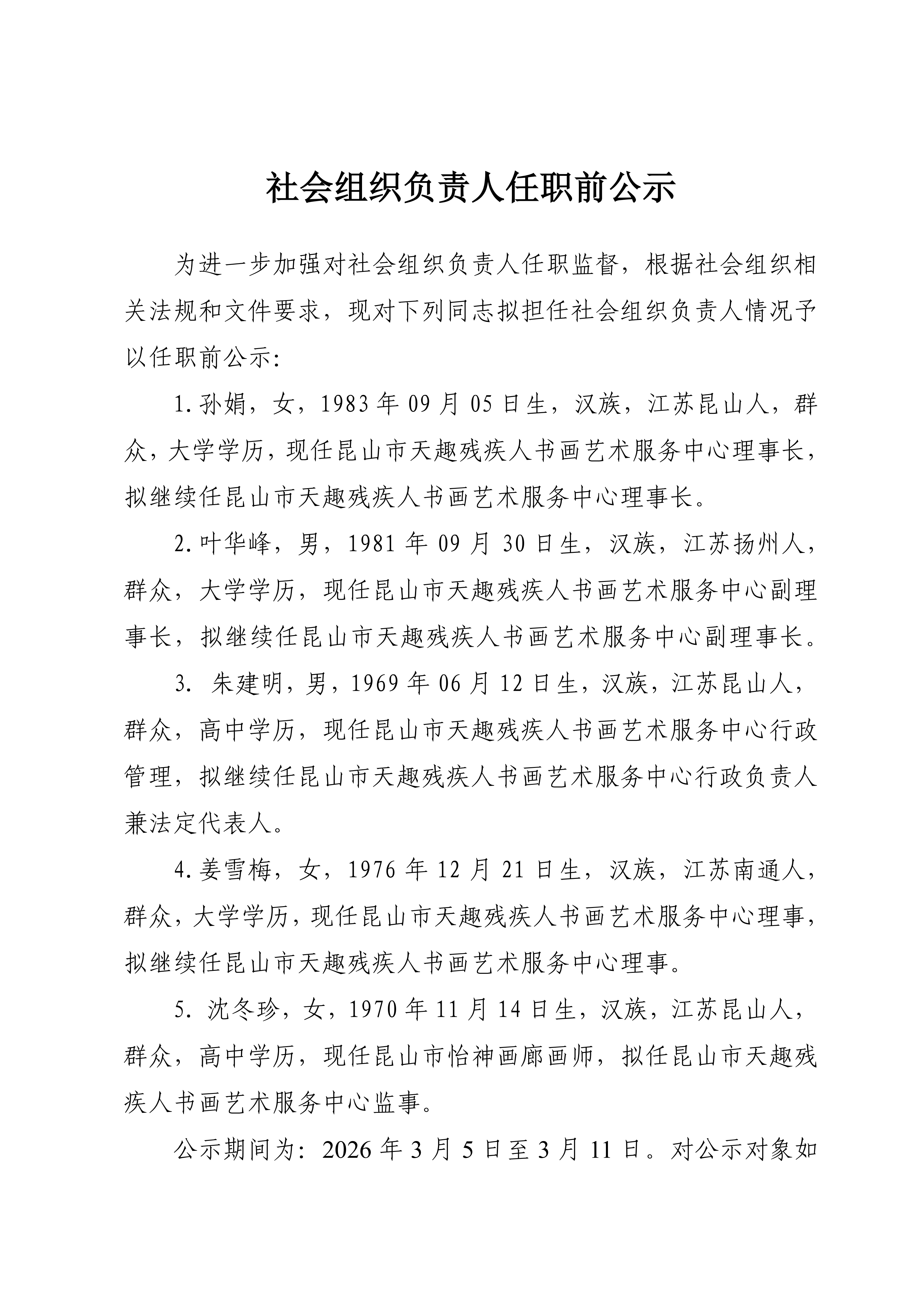 昆山市天趣残疾人书画艺术服务中心负责人任职前公示