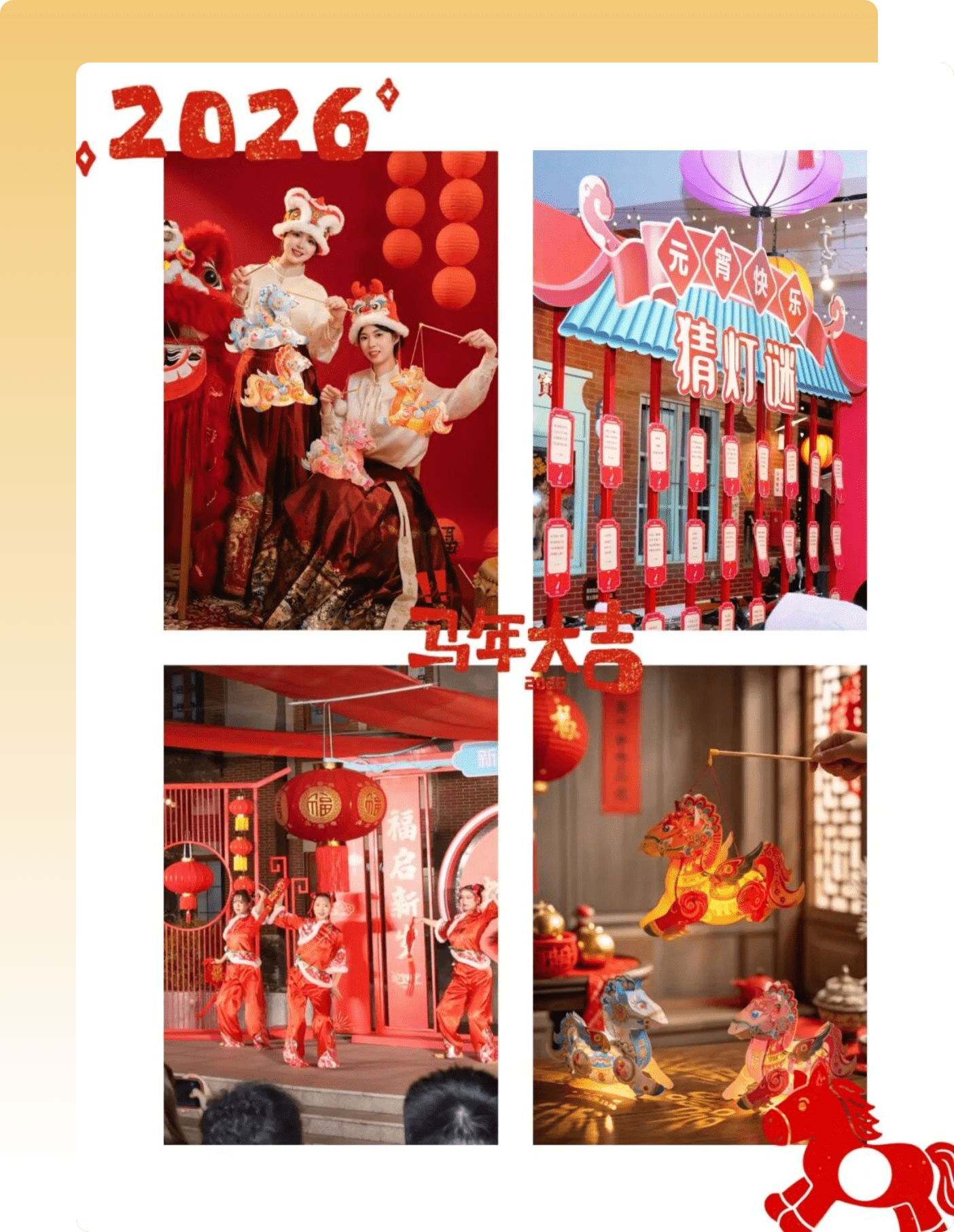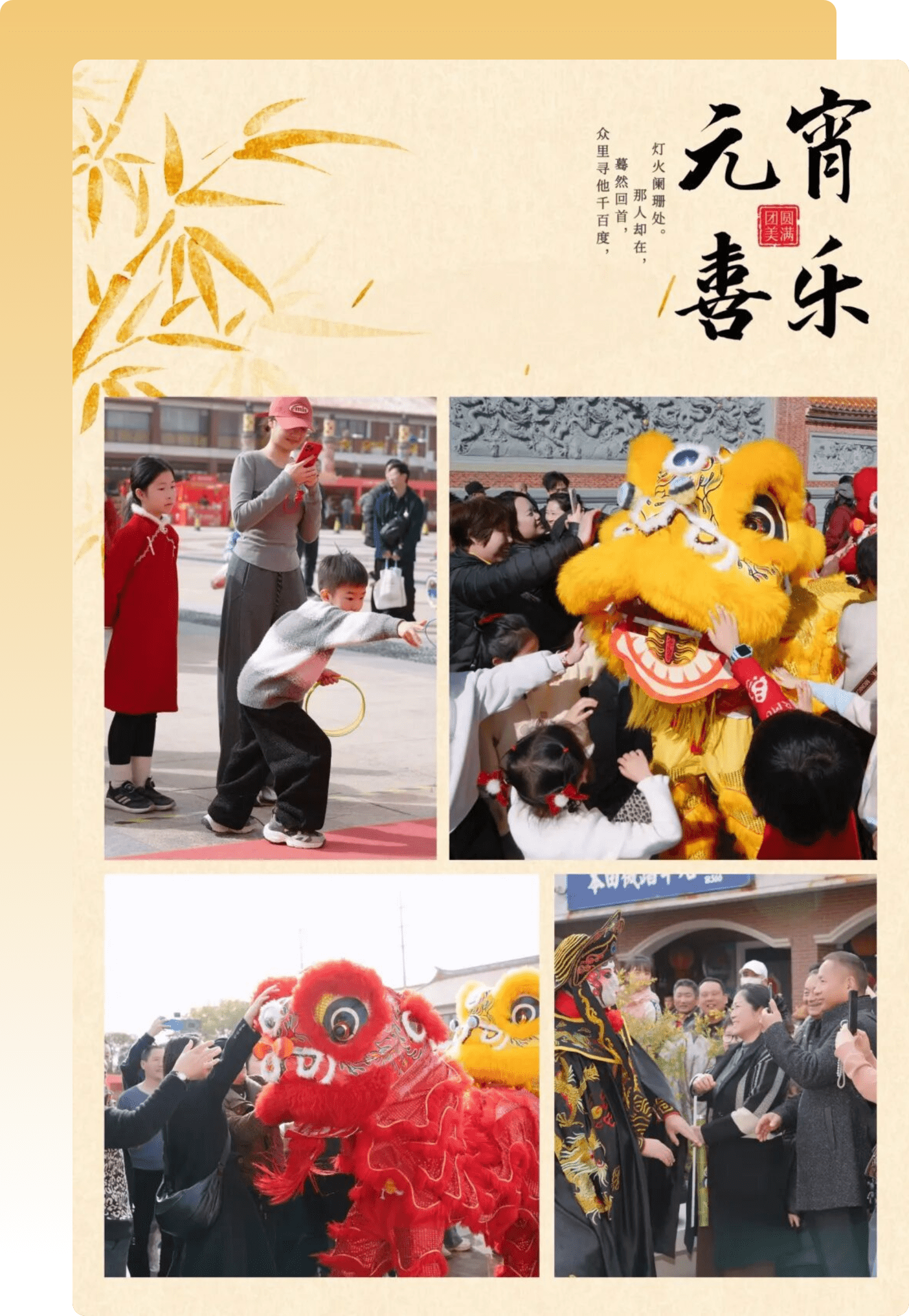 锣鼓闹元宵 · 舞狮巡游添喜气。元宵之夜,锣鼓喧天,热闹开场。灵动威武的舞狮表演,在商业街区间隔巡游,腾跃翻转,气势十足,为大家送上元宵吉祥祝福。一步一热闹,一眼一喜庆,氛围感直接拉满!