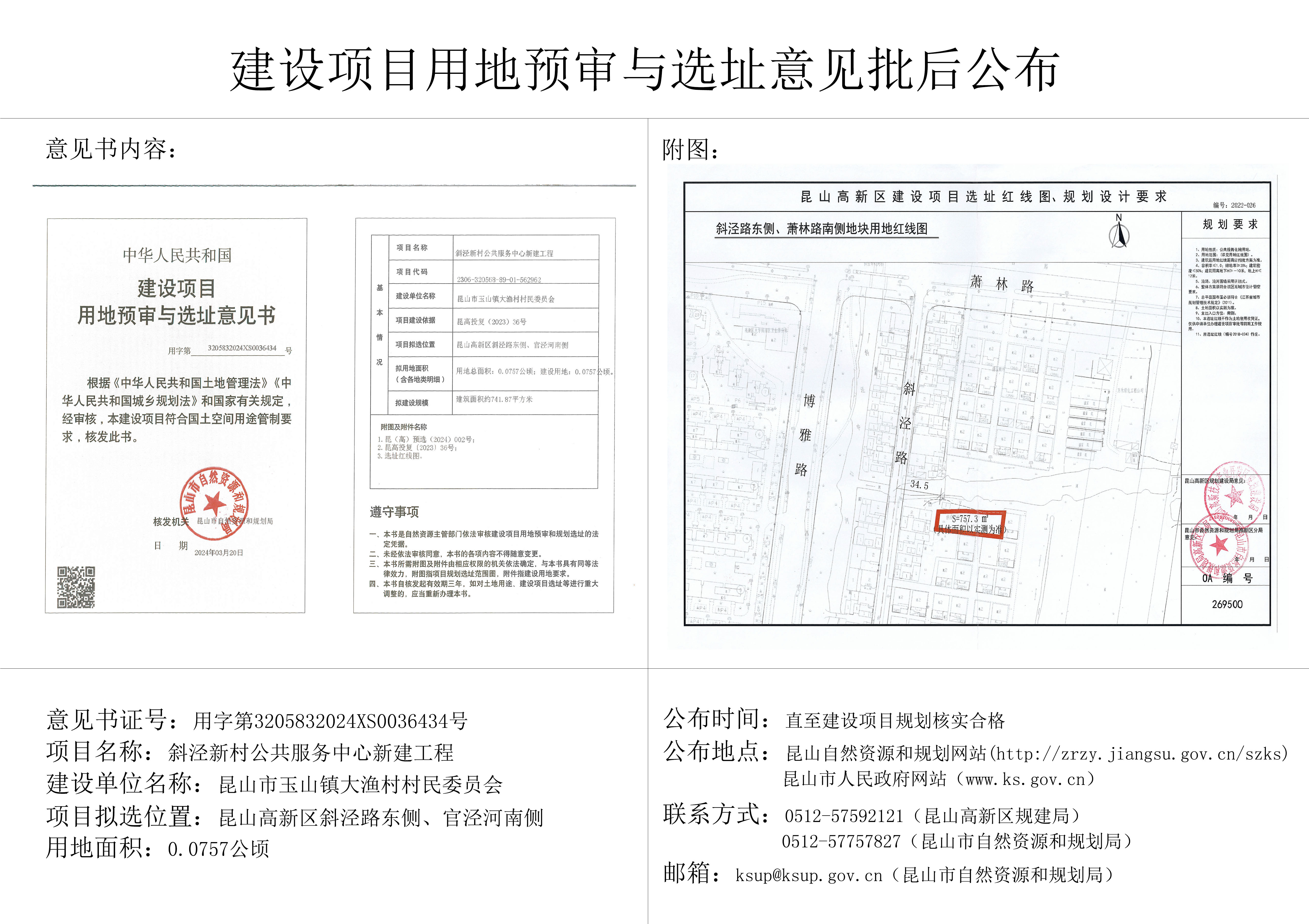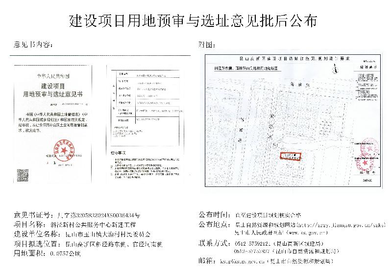 昆山高新区建设工程规划许可证批后公布(斜泾新村公共服务中心新建工程用地预审与选址意见书)