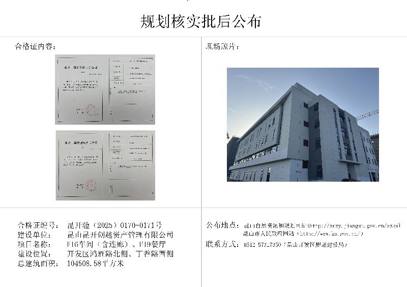 昆山开发区规划建设局关于昆山昆开创越资产管理有限公司F16车间(含连廊)、F19餐厅规划核实的批后公布