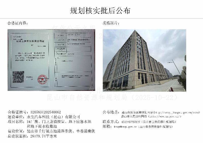 永生汽车科技(昆山)有限公司1#厂房、门卫兼消控室、地下应急水池和地下雨水收集池规划核实批后公布