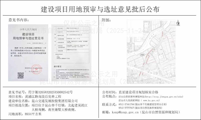 黄浦江路南段后完善工程建设项目用地预审与选址意见批后公布