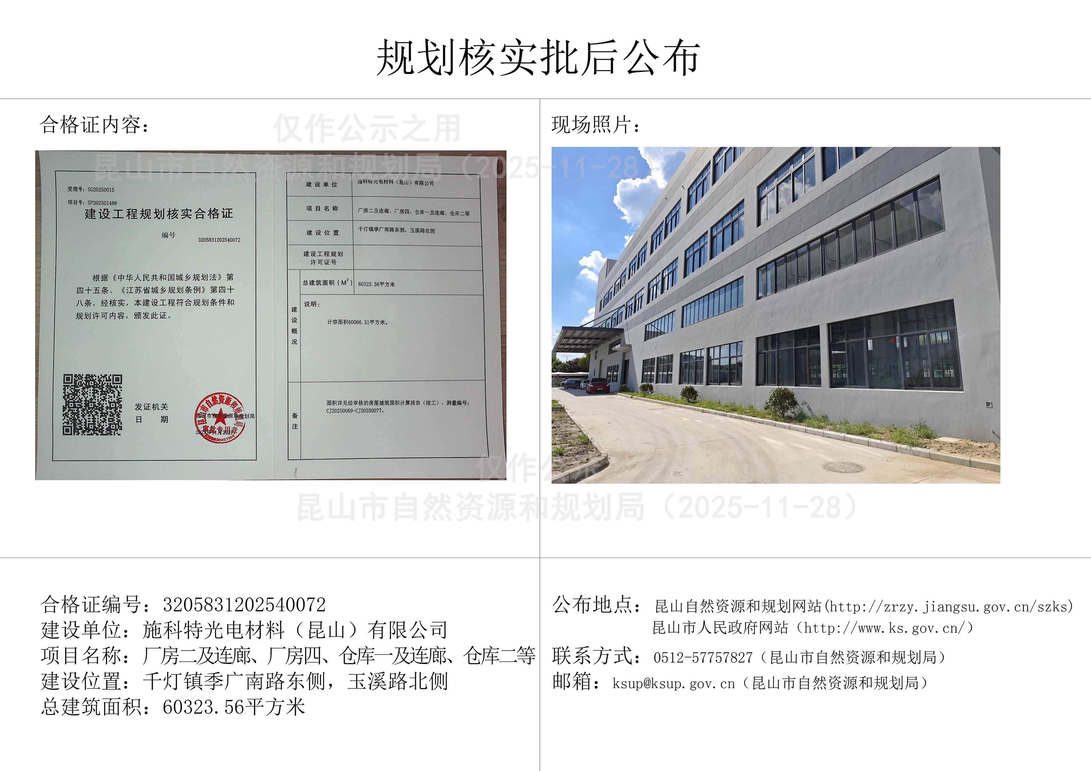 施科特光电材料(昆山)有限公司厂房二及连廊、厂房四、仓库一及连廊、仓库二等规划核实批后公布