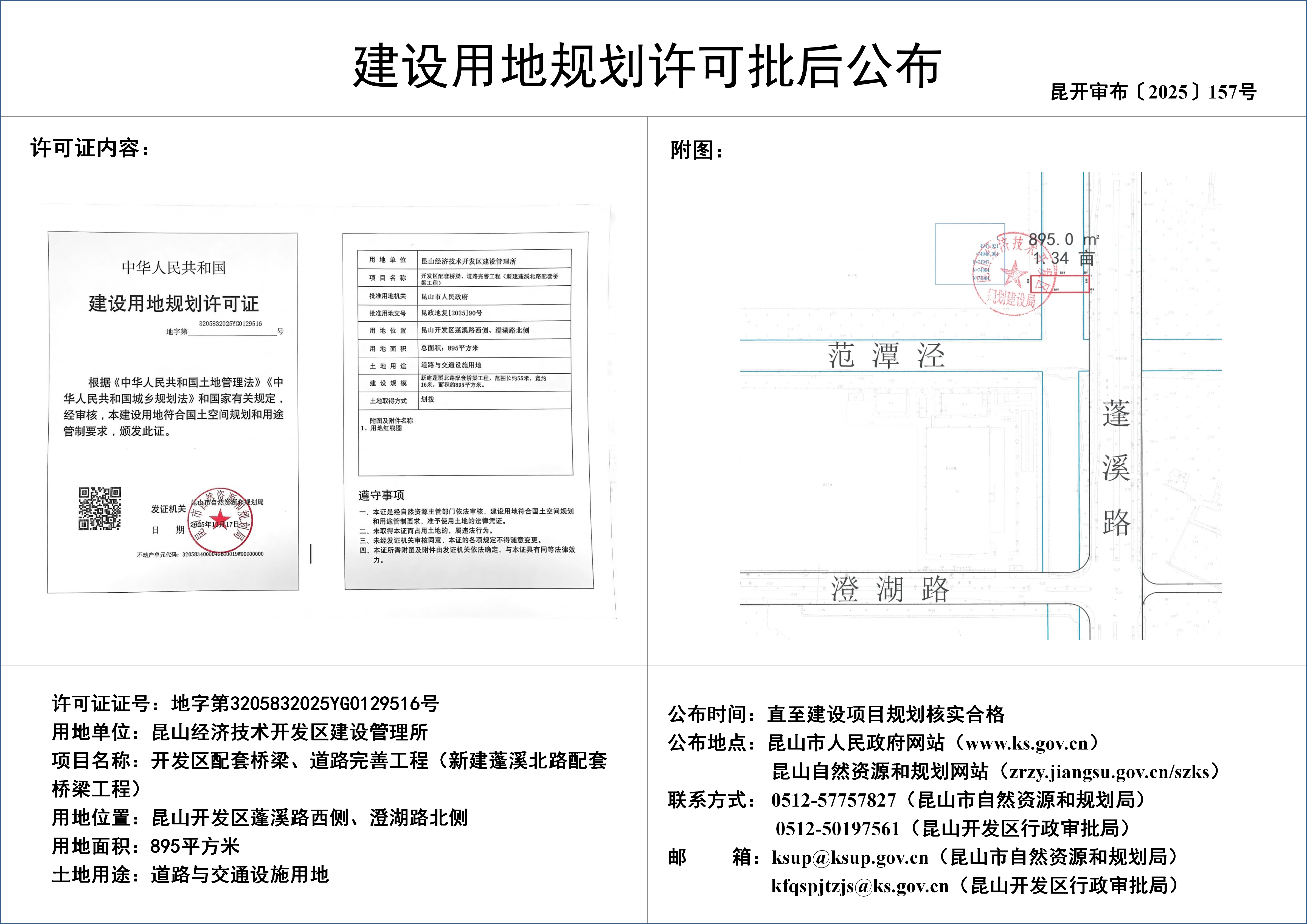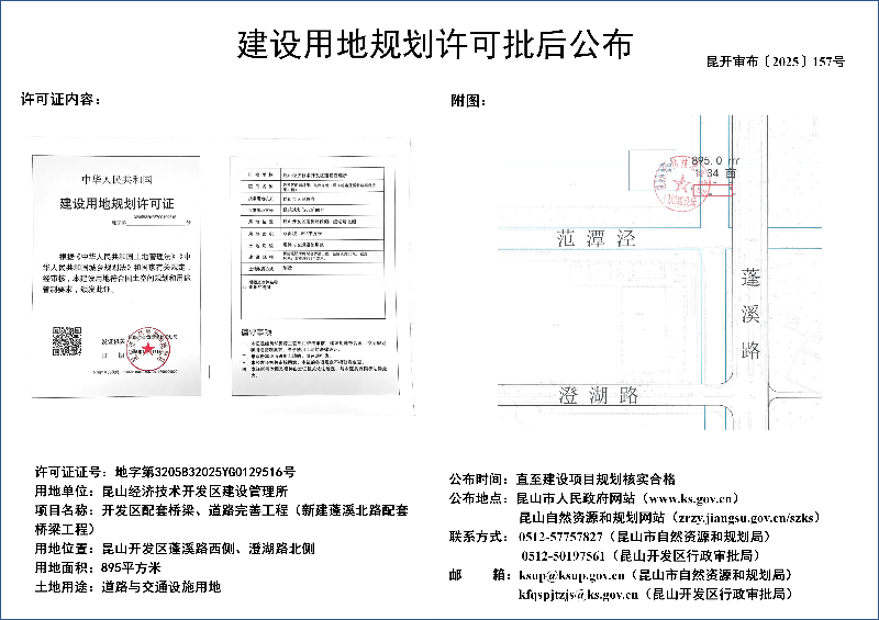 昆山经济技术开发区建设管理所开发区配套桥梁、道路完善工程(新建蓬溪北路配套桥梁工程)建设用地规划许可批后公布