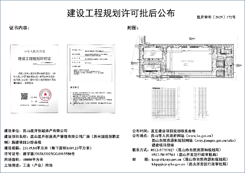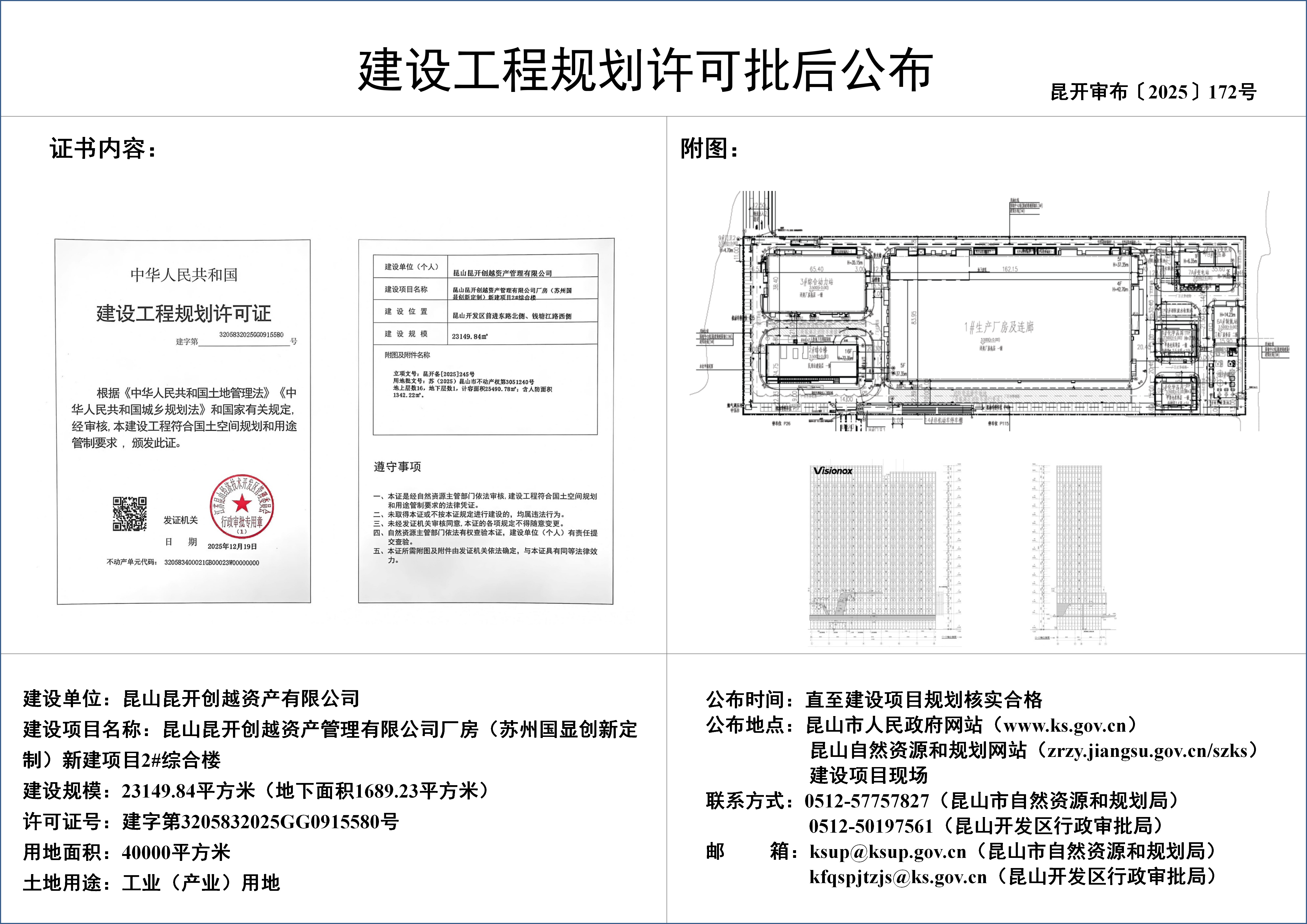昆山昆开创越资产管理有限公司厂房(苏州国显创新定制)新建项目2#综合楼建设工程规划许可批后公布