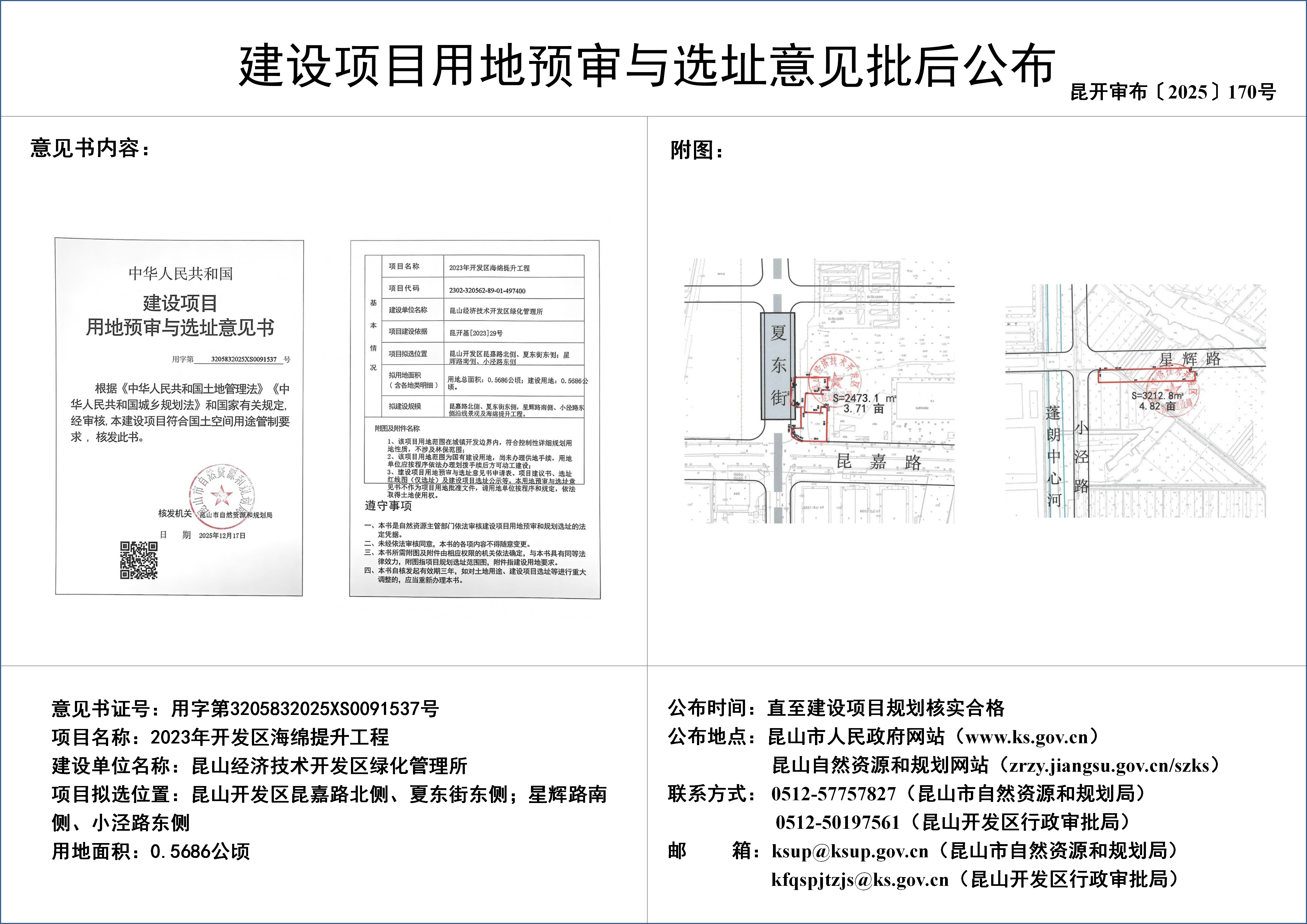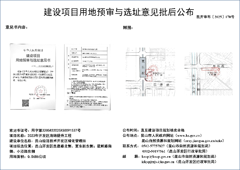 昆山经济技术开发区绿化管理所2023年开发区海绵提升工程建设项目用地预审与选址意见批后公布