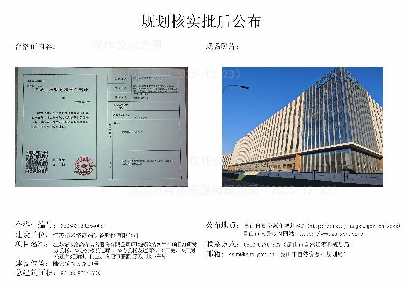 江苏拓米洛高端装备股份有限公司环境装备生产项目A1研发办公楼等规划核实批后公布