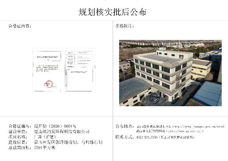 昆山开发区规划建设局关于昆山欣鸿发环保科技有限公司厂房(扩建)规划核实的批后公布