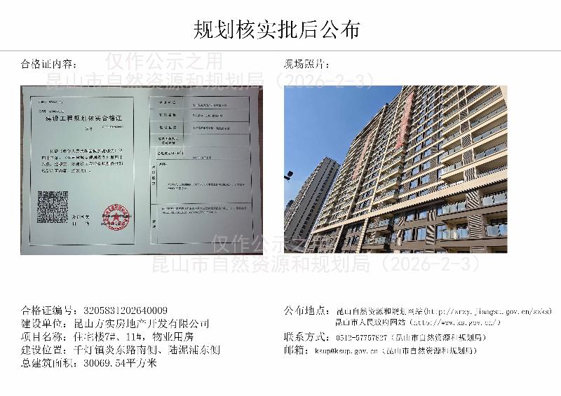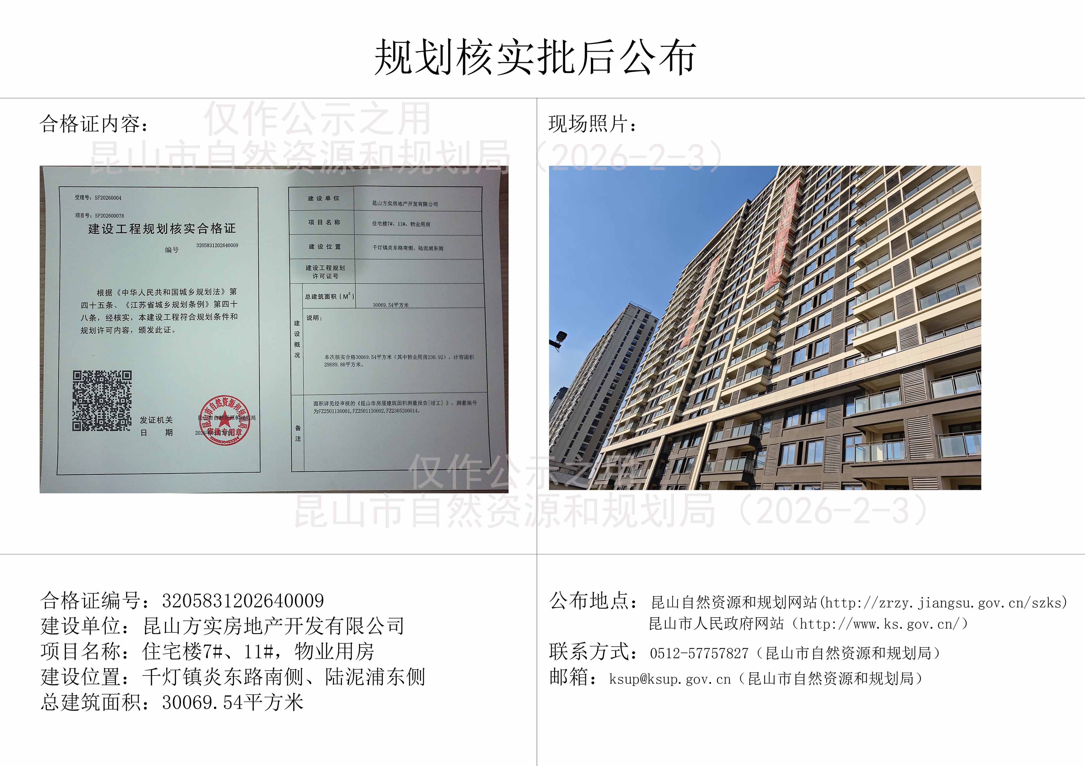 昆山方实房地产开发有限公司住宅楼7#、11#,物业用房规划核实批后公布