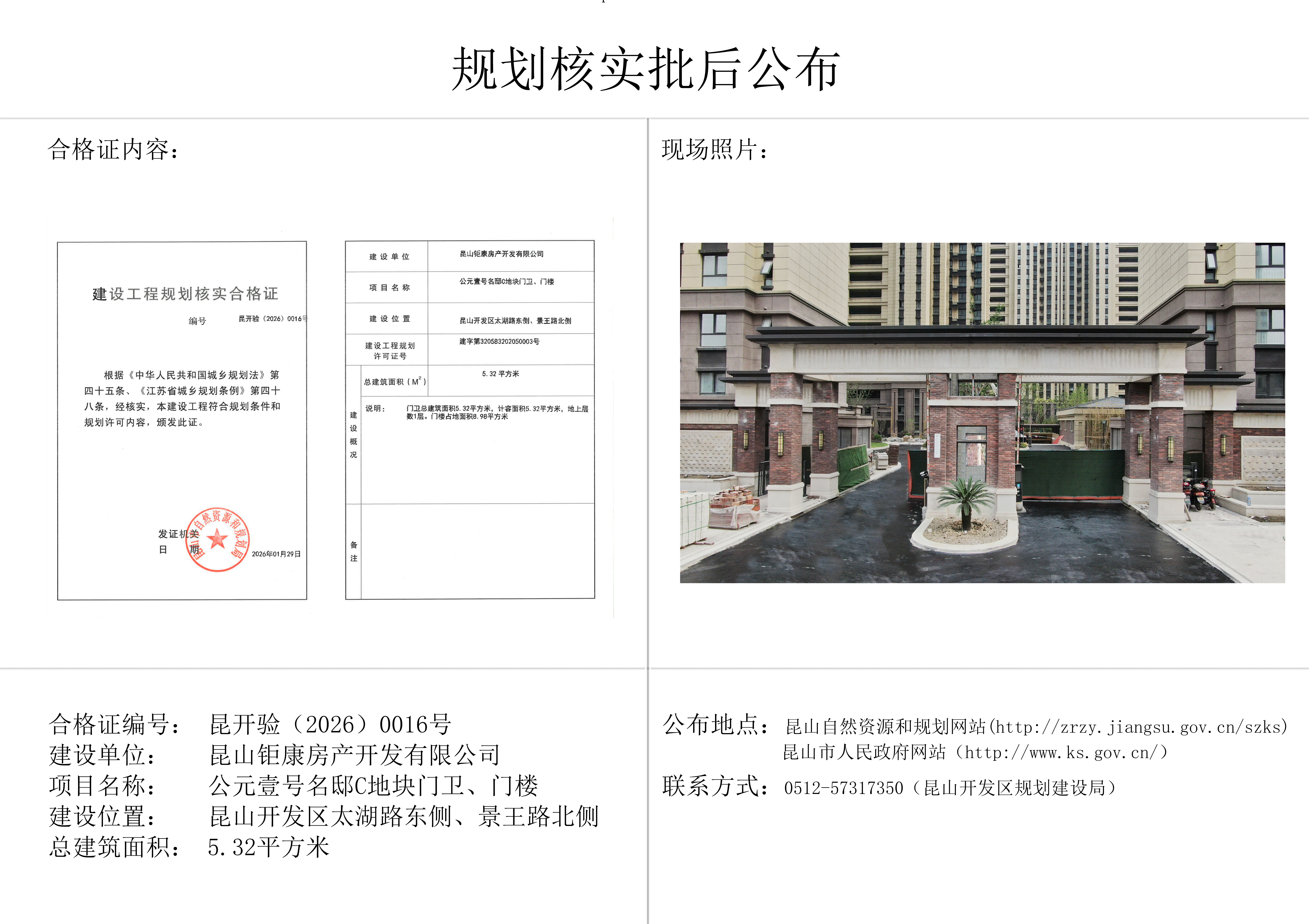 昆山钜康房产开发有限公司公元壹号名邸C地块门卫、门楼规划核实的批后公布