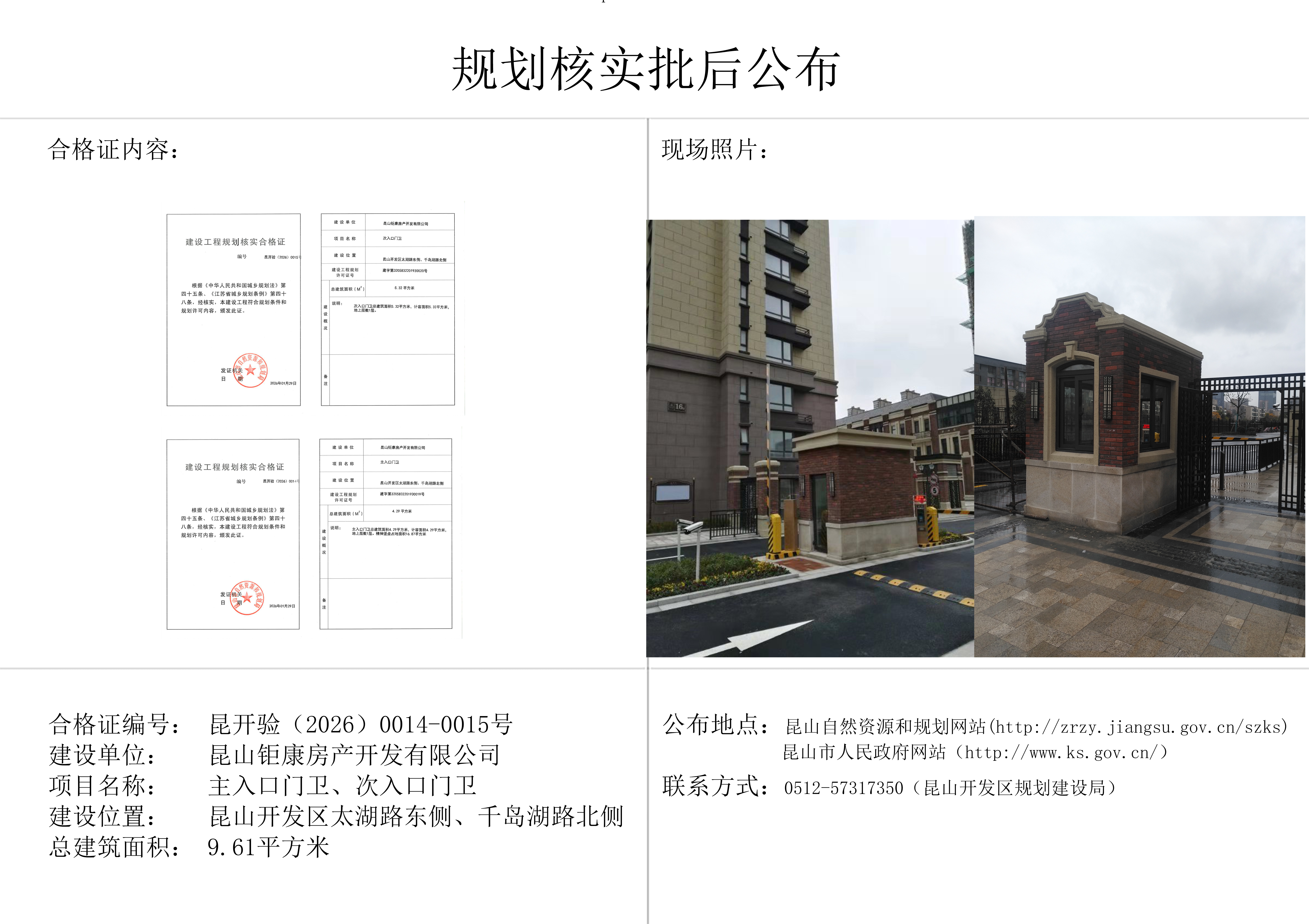 昆山开发区规划建设局关于昆山钜康房产开发有限公司主入口门卫、次入口门卫规划核实的批后公布