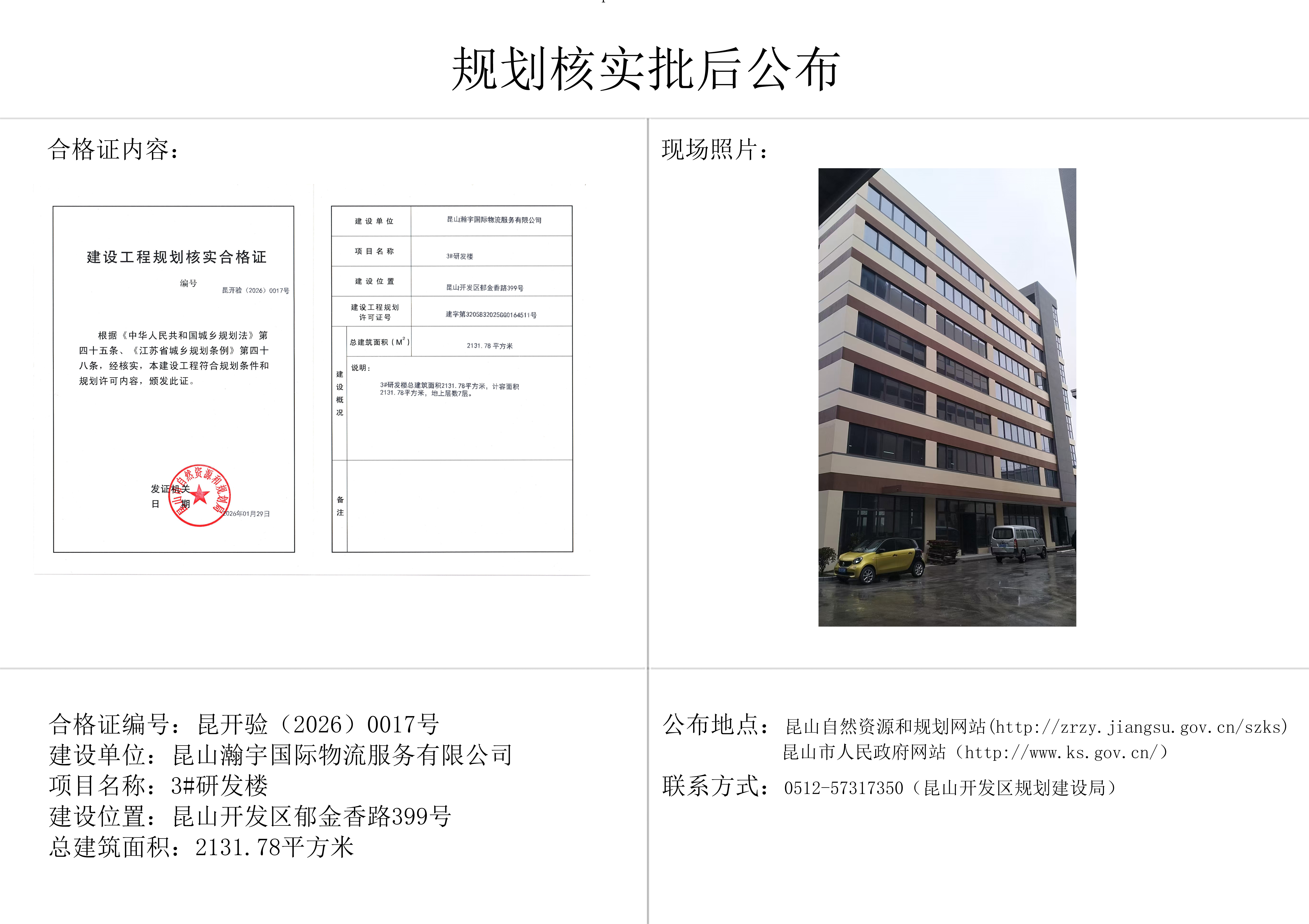 昆山开发区规划建设局关于昆山瀚宇国际物流服务有限公司3#研发楼规划核实的批后公布