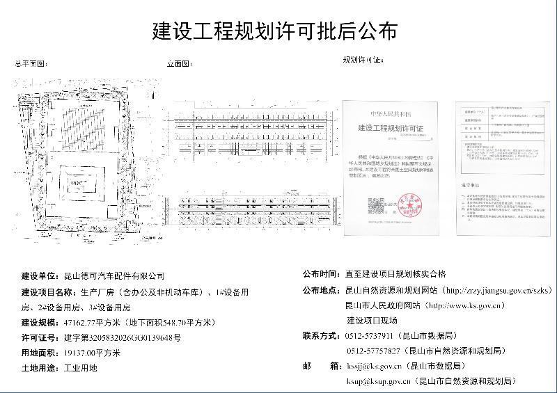 昆山德可汽车配件有限公司生产厂房(含办公及非机动车库)、1#设备用房、2#设备用房、3#设备用房批后公布
