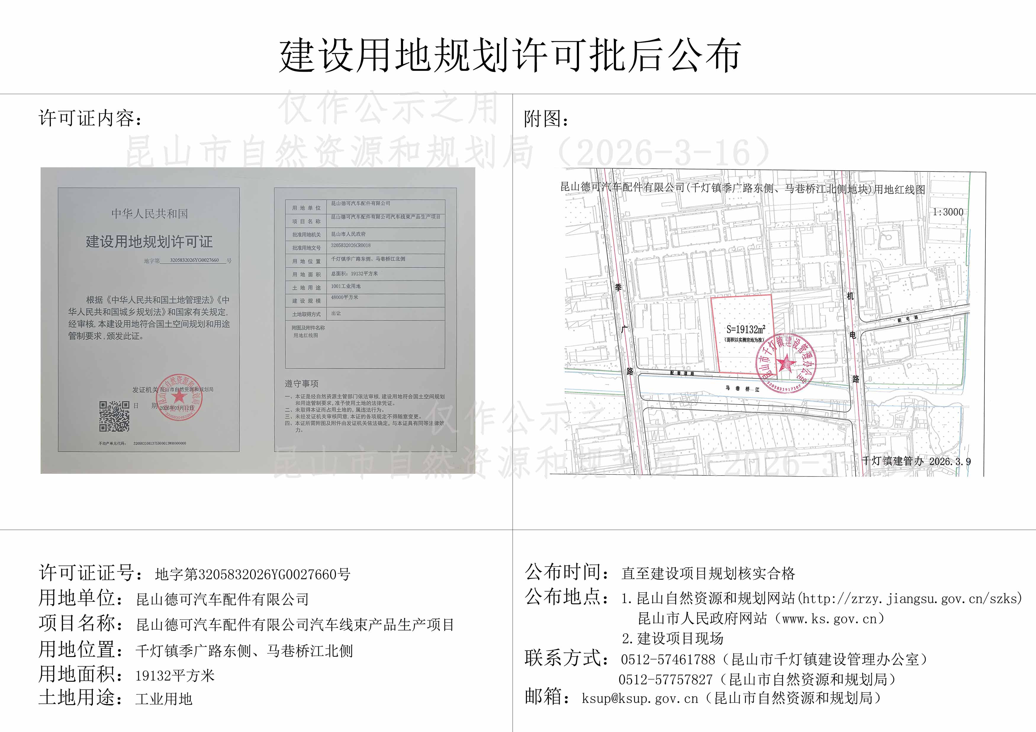 昆山德可汽车配件有限公司汽车线束产品生产项目建设用地规划许可批后公布