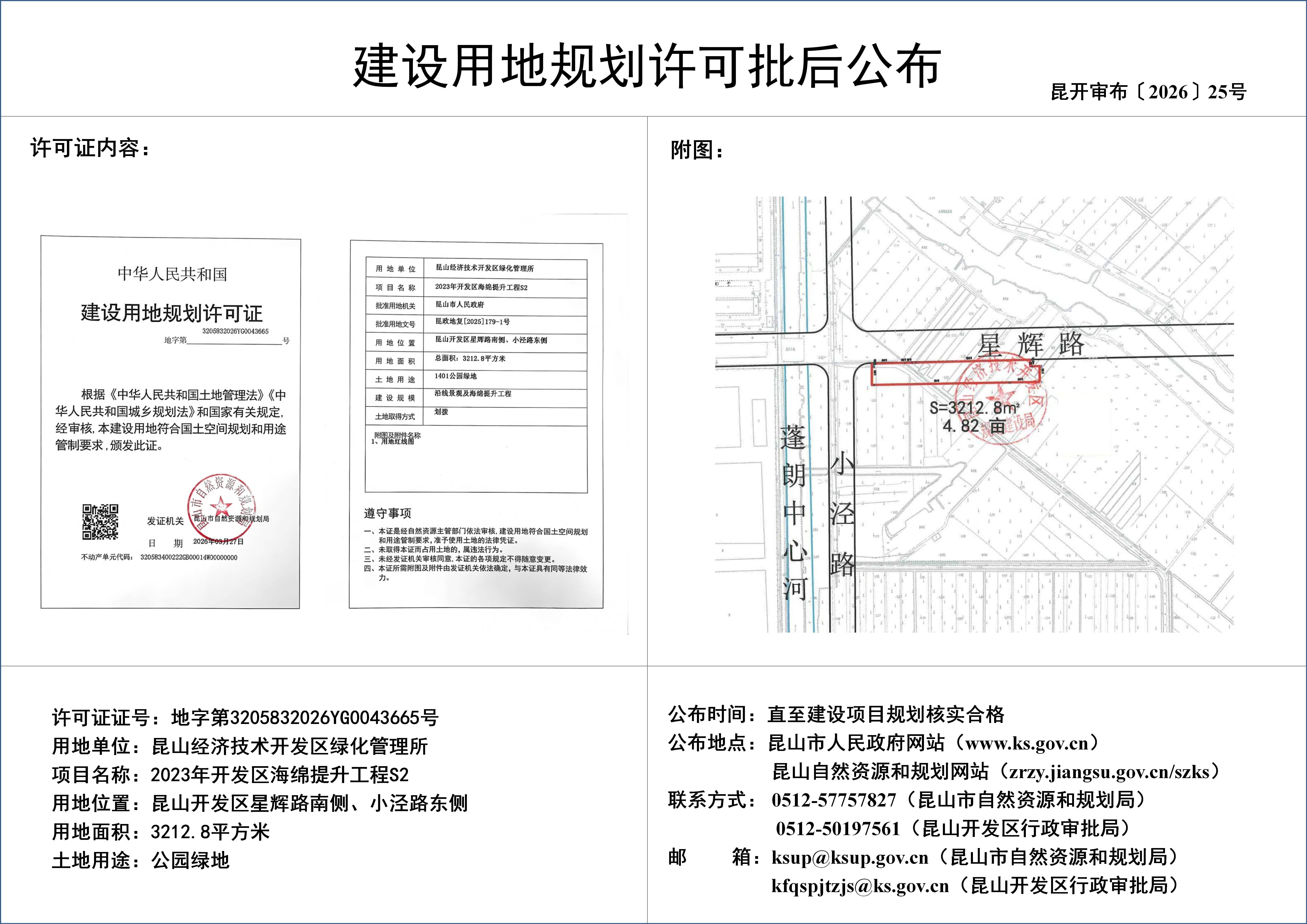昆山经济技术开发区绿化管理所2023年开发区海绵提升工程S2建设用地规划许可批后公布
