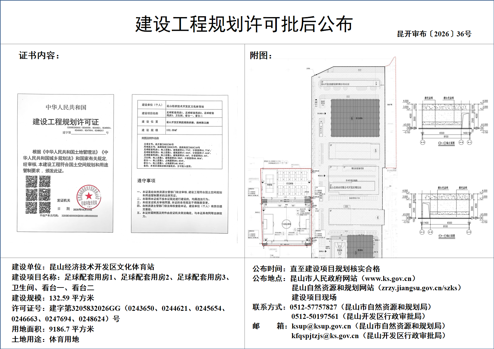 昆山经济技术开发区文化体育站足球配套用房1、足球配套用房2、足球配套用房3、卫生间、看台一、看台二建设工程规划许可批后公布
