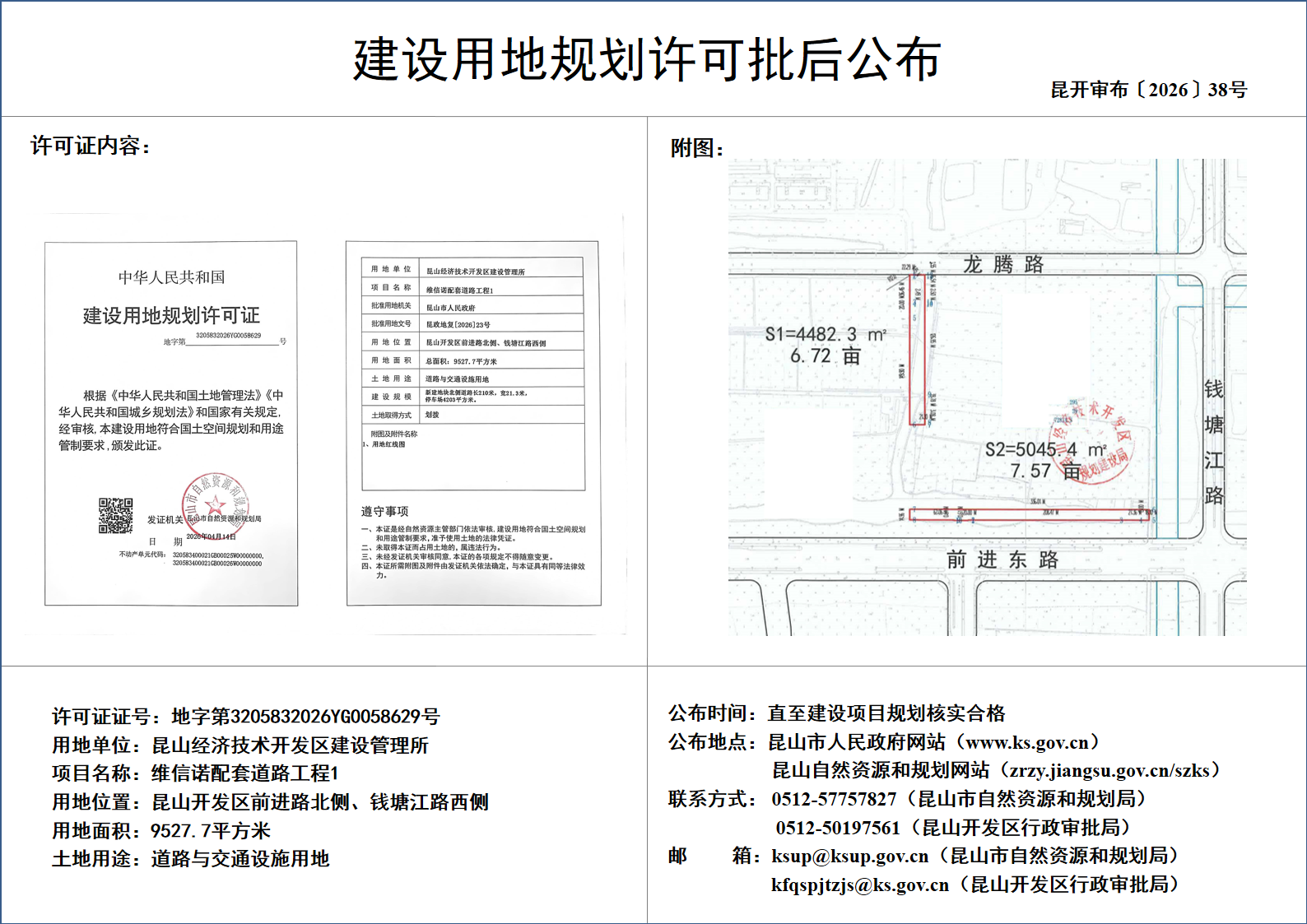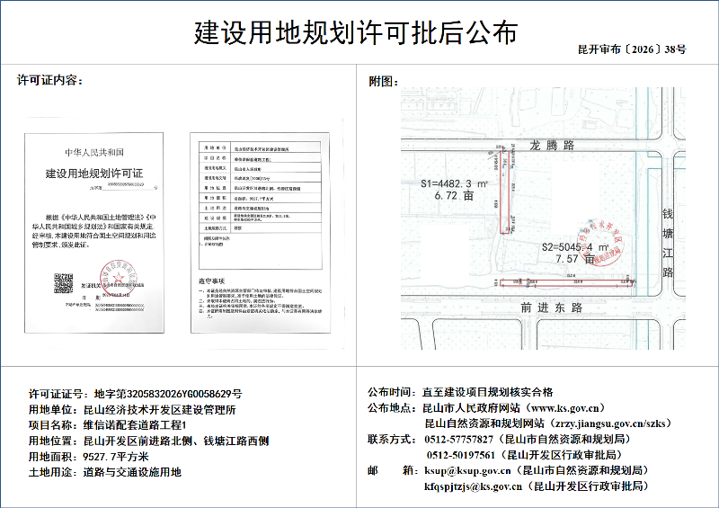昆山经济技术开发区建设管理所维信诺配套道路工程1建设用地规划许可批后公布