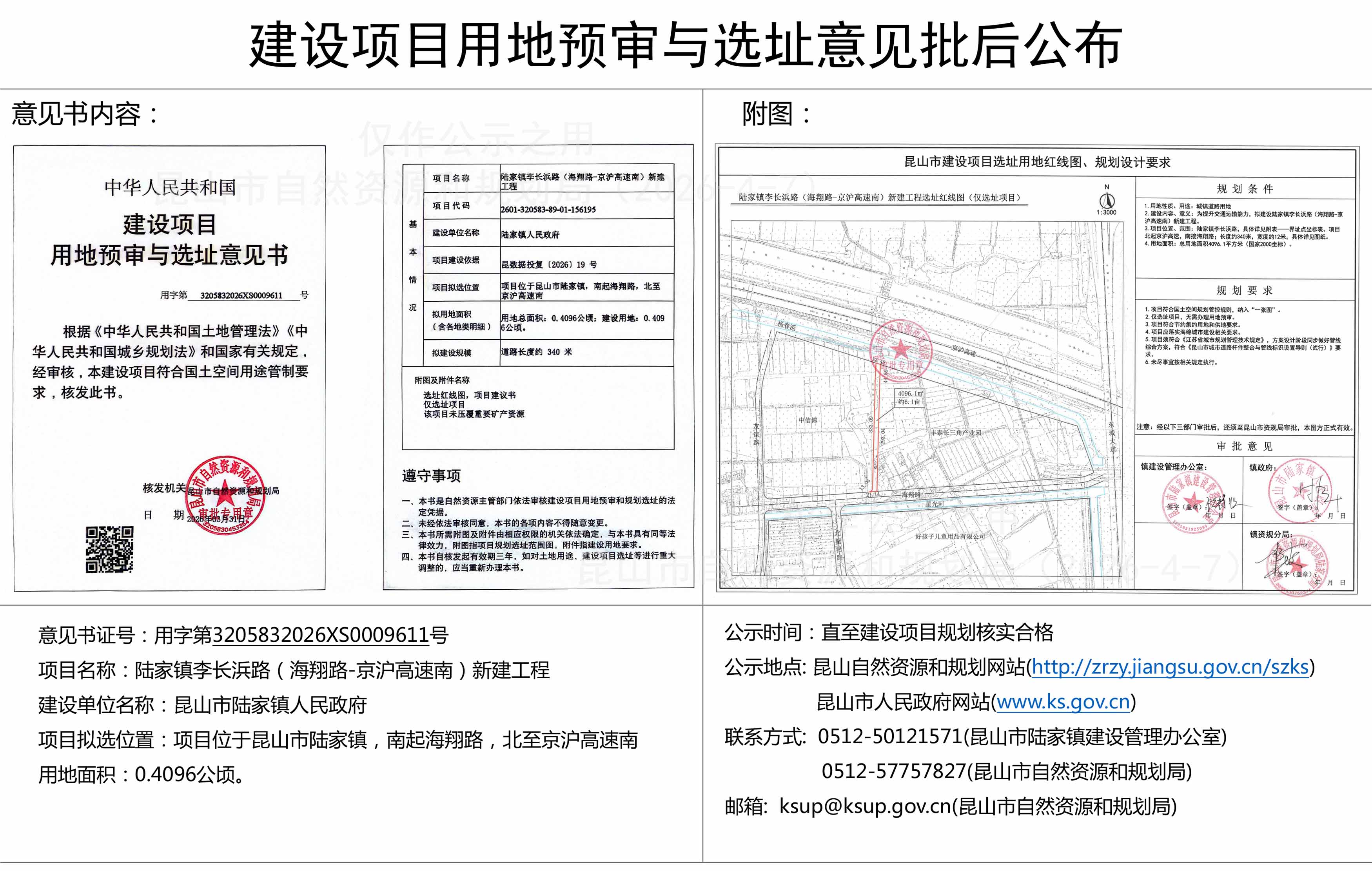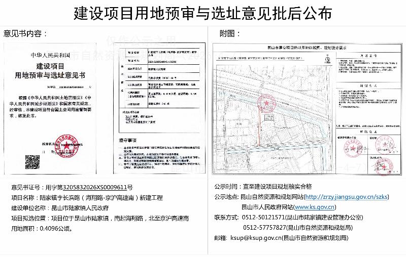陆家镇李长浜路(海翔路-京沪高速南)新建工程建设项目用地预审与选址意见批后公布