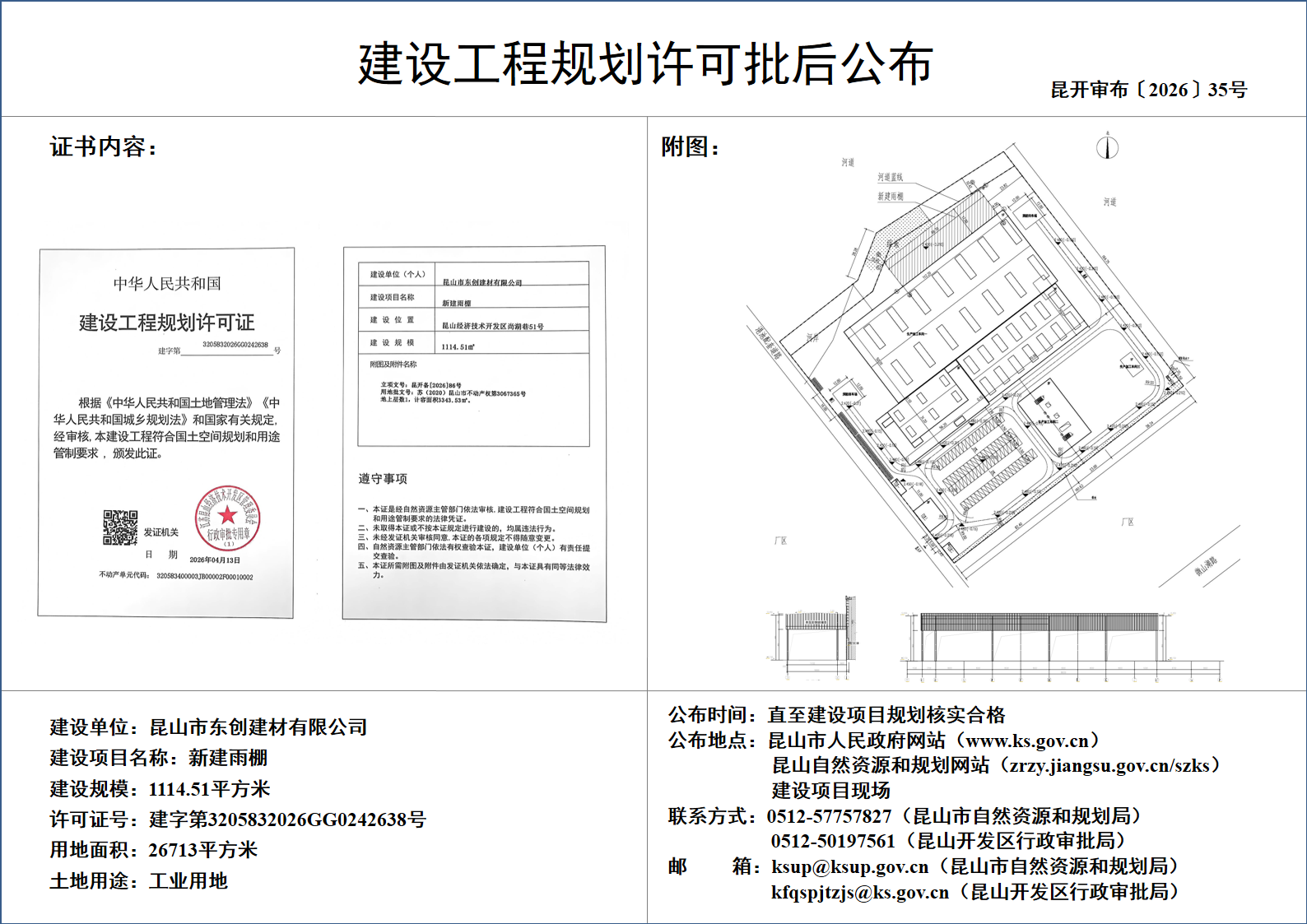 昆山市东创建材有限公司新建雨棚建设工程规划许可批后公布