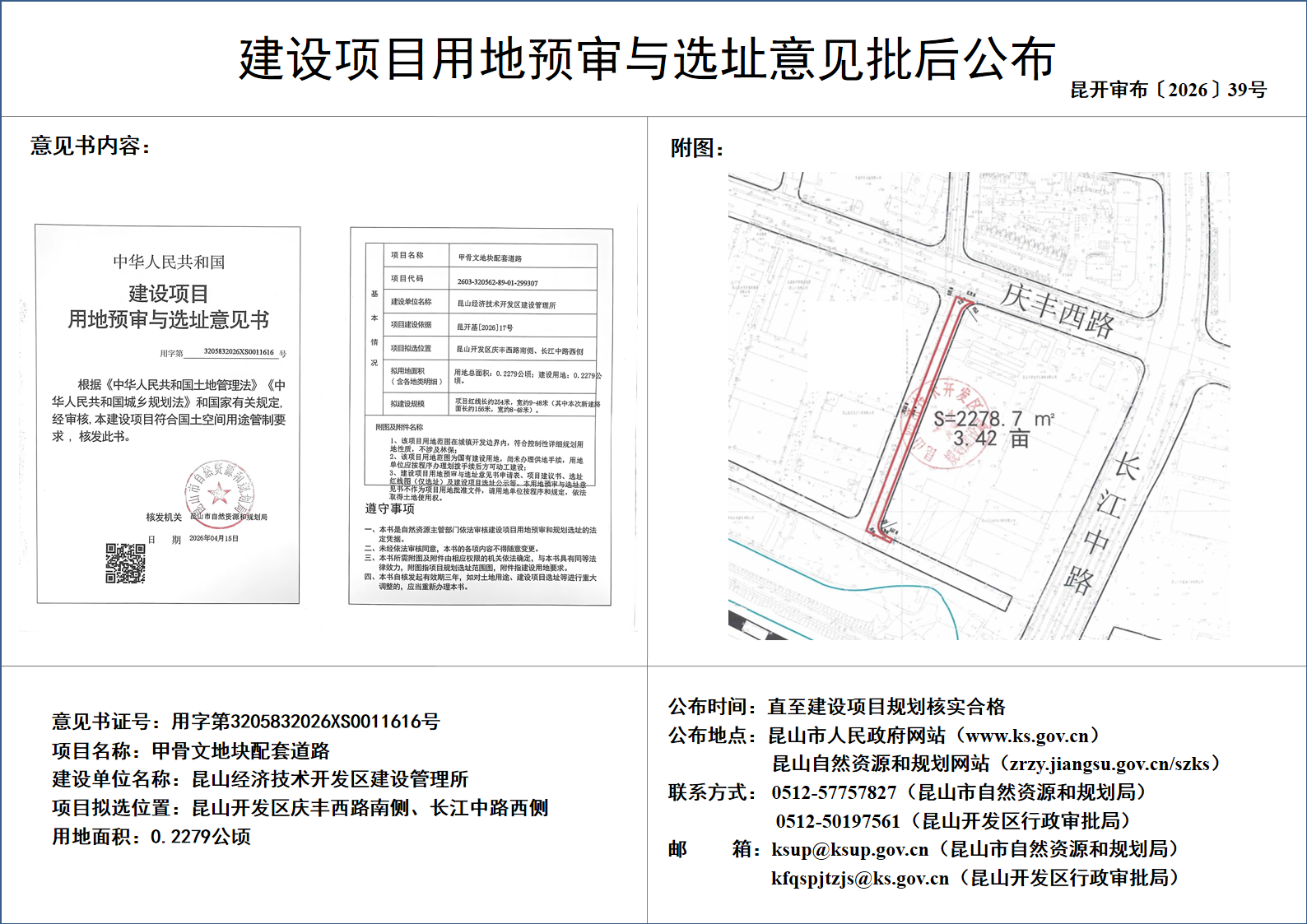昆山经济技术开发区建设管理所甲骨文地块配套道路建设项目用地预审与选址意见批后公布