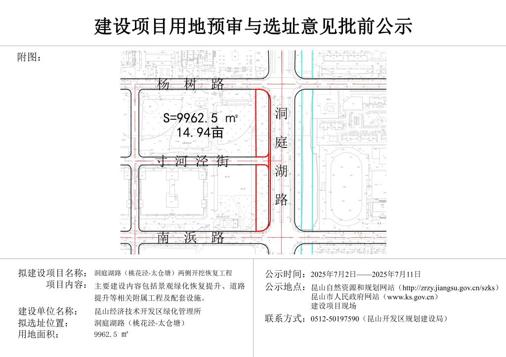 昆山开发区规划建设局关于洞庭湖路(桃花泾-太仓塘)两侧开挖恢复工程项目选址的批前公示