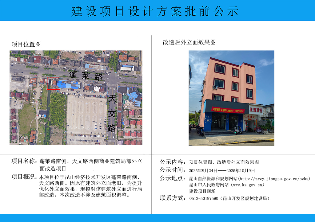 昆山开发区规划建设局关于蓬菜路南侧、天文路西侧商业建筑局部外立面改造项目的批前公示