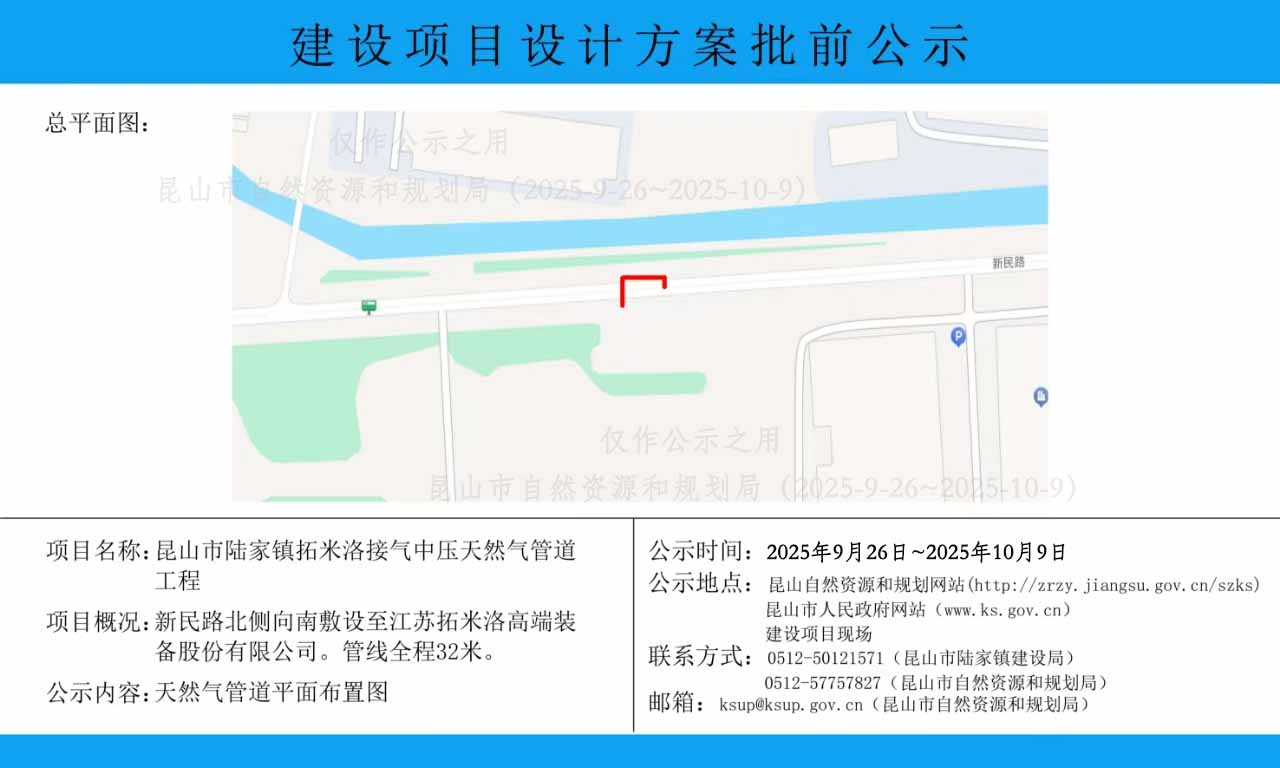 昆山市陆家镇拓米洛接气中压天然气管道工程建设项目设计方案批前公示
