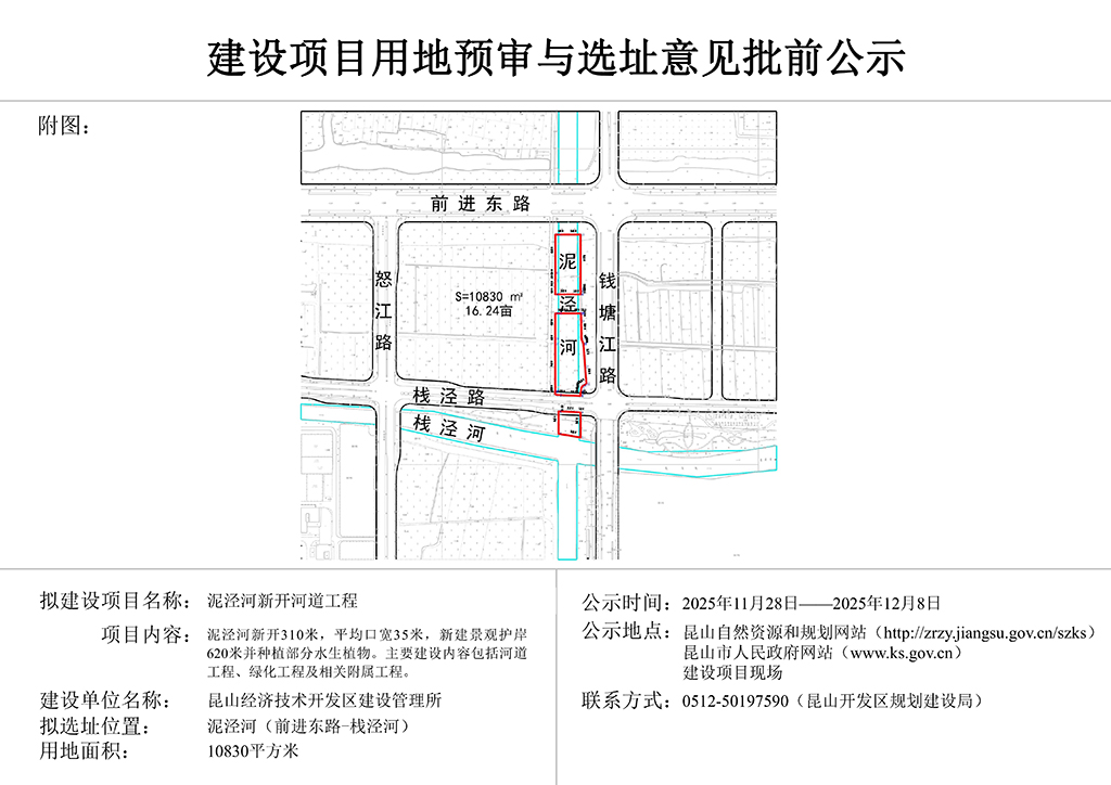 昆山开发区规划建设局关于泥泾河新开河道工程选址的批前公示