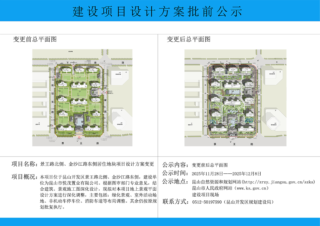 昆山开发区规划建设局关于景王路北侧、金沙江路东侧居住地块项目设计方案变更的批前公示