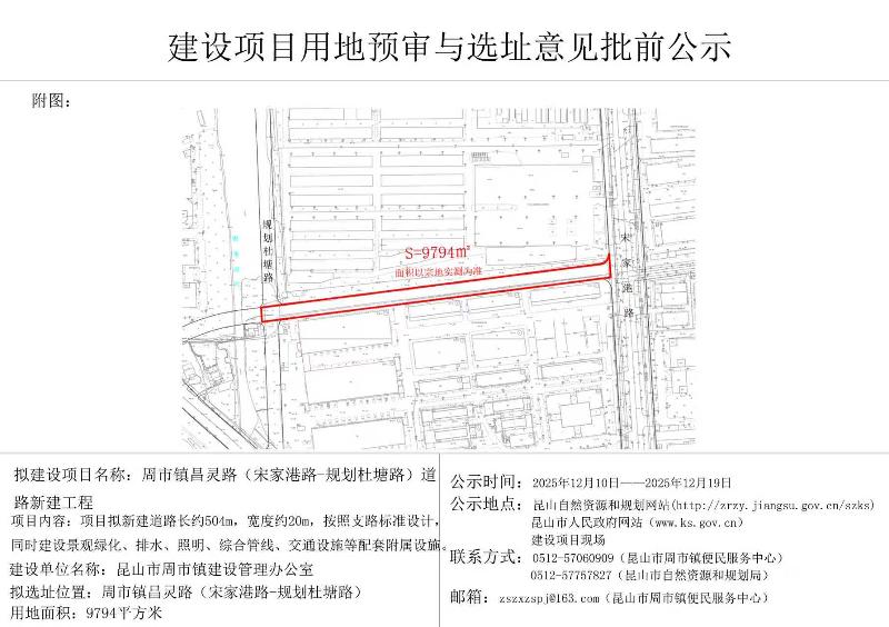 周市镇昌灵路(宋家港路-规划杜塘路)道路新建工程-建设项目用地预审与选址意见批前公示