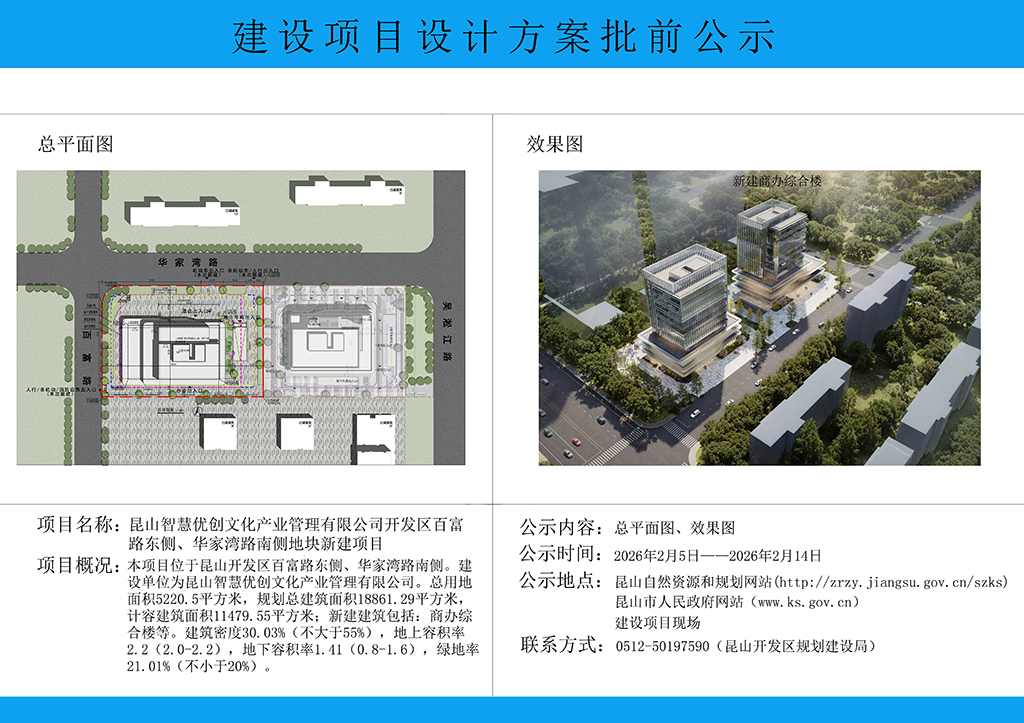 昆山开发区规划建设局关于昆山智慧优创文化产业管理有限公司开发区百富路东侧、华家湾路南侧地块新建项目设计方案的批前公示