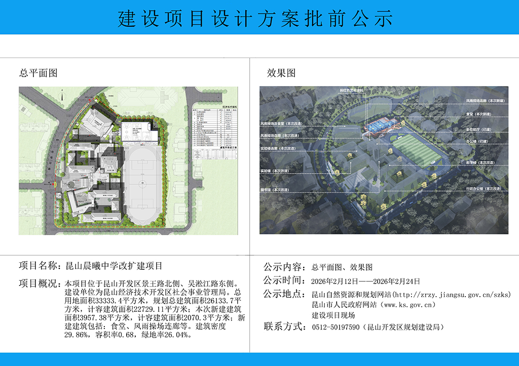 昆山开发区规划建设局关于昆山晨曦中学改扩建项目设计方案的批前公示