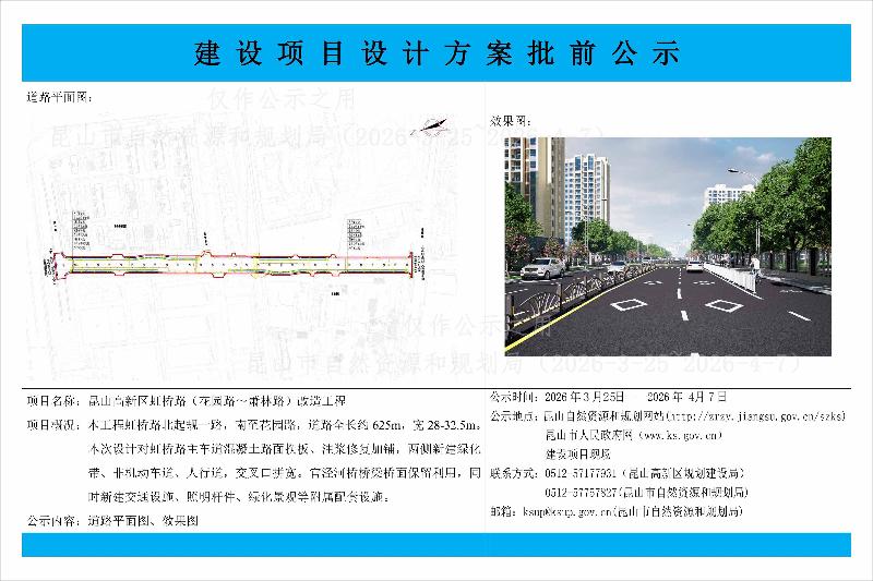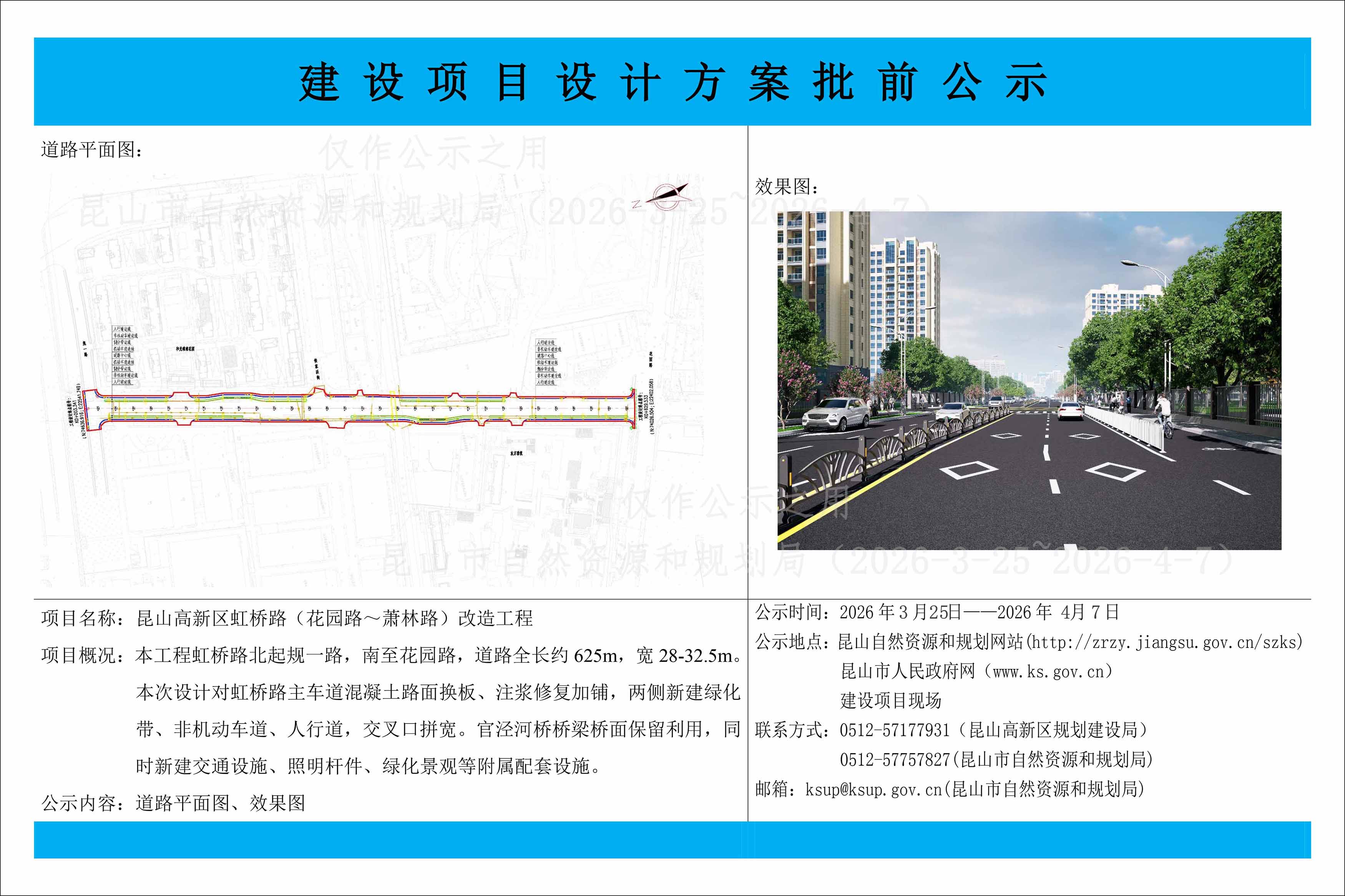 昆山高新区虹桥路(花园路~萧林路)改造工程建设项目设计方案批前公示