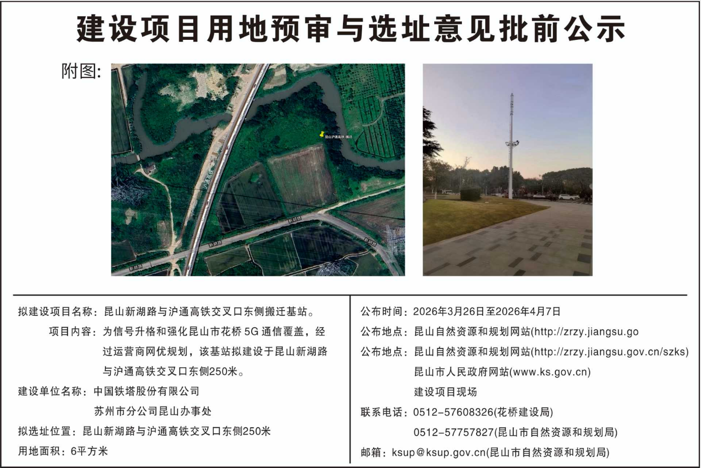 昆山新湖路与沪通高铁交叉口东侧搬迁基站建设项目用地预审与选址意见批前公示