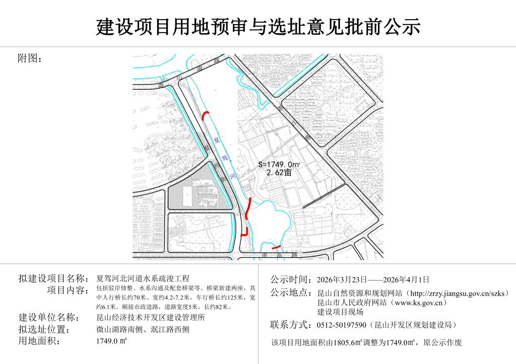 昆山开发区规划建设局关于夏驾河北河道水系疏浚工程项目选址的批前公示