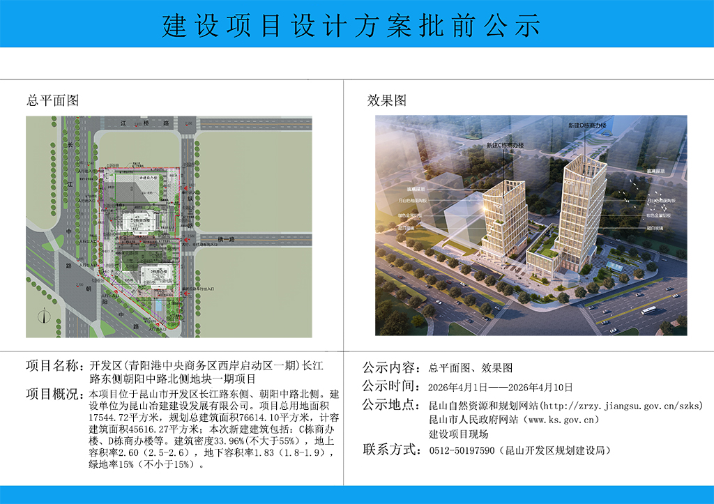 昆山开发区规划建设局关于开发区(青阳港中央商务区西岸启动区一期)长江路东侧朝阳中路北侧地块一期项目设计方案的批前公示