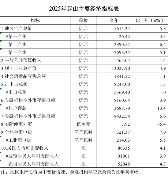 2025年昆山主要经济指标表