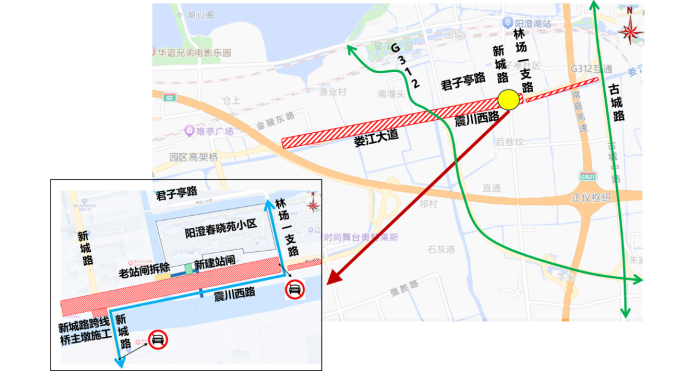 昆山段的震川西路—新城路节点绕行路线: