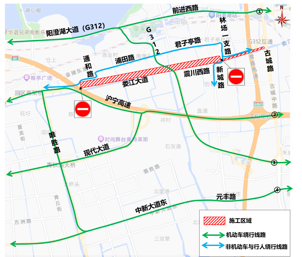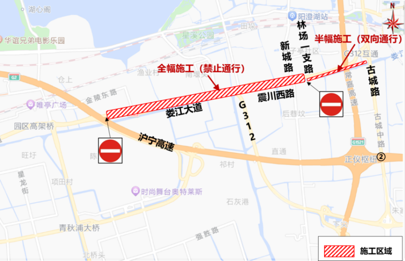 (一)娄江大道—震川西路(沪宁连接线入口东至林场一支路段)实施全封闭施工,禁止机动车、非机动车和行人东西方向通行。