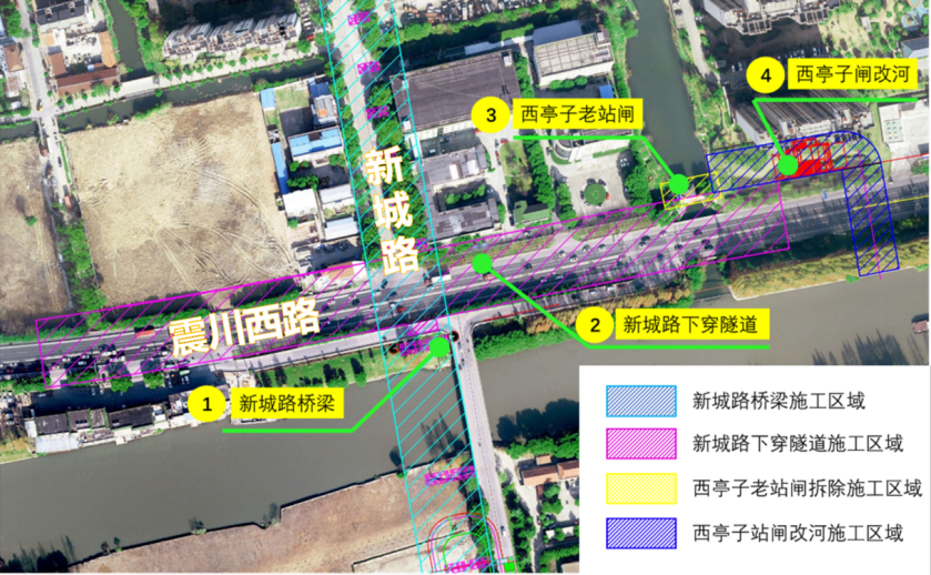 娄江大道—震川西路改造工程昆山段建设两个下穿隧道,其中新城路隧道位于震川西路—新城路平交口,此处共有4个施工节点需同步实施: